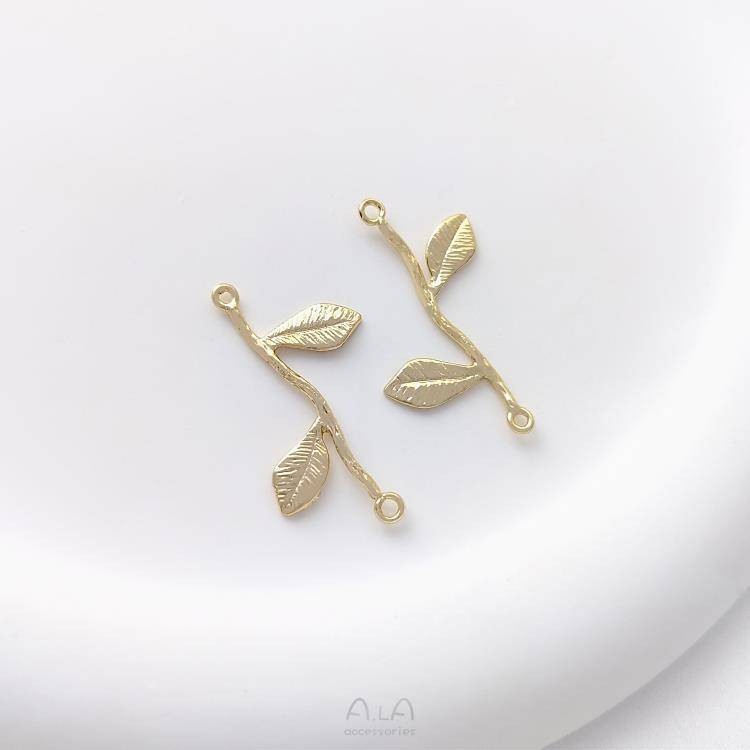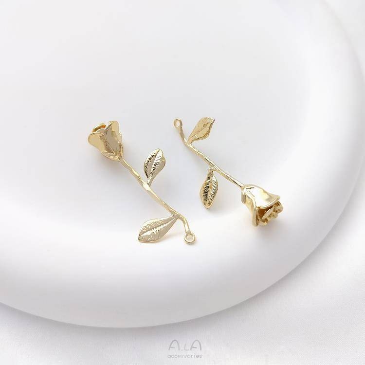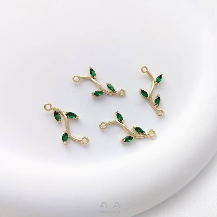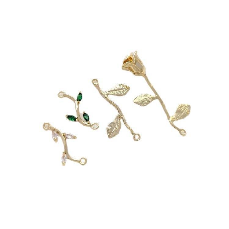 宏雲Hongyun-Ala新品-14k包金雙吊樹枝玫瑰花綠鋯樹葉diy手鍊雙掛耳環耳墜流蘇吊墜配件
