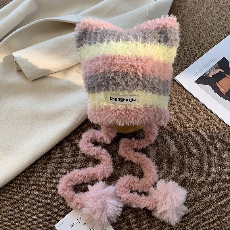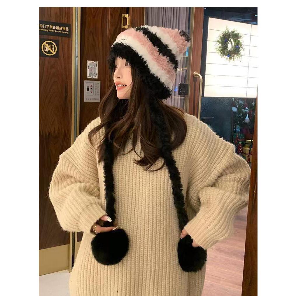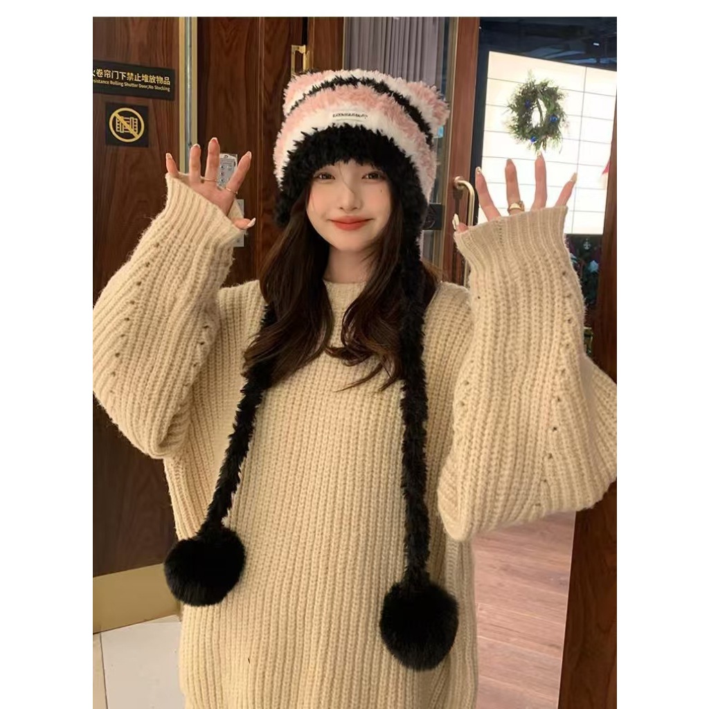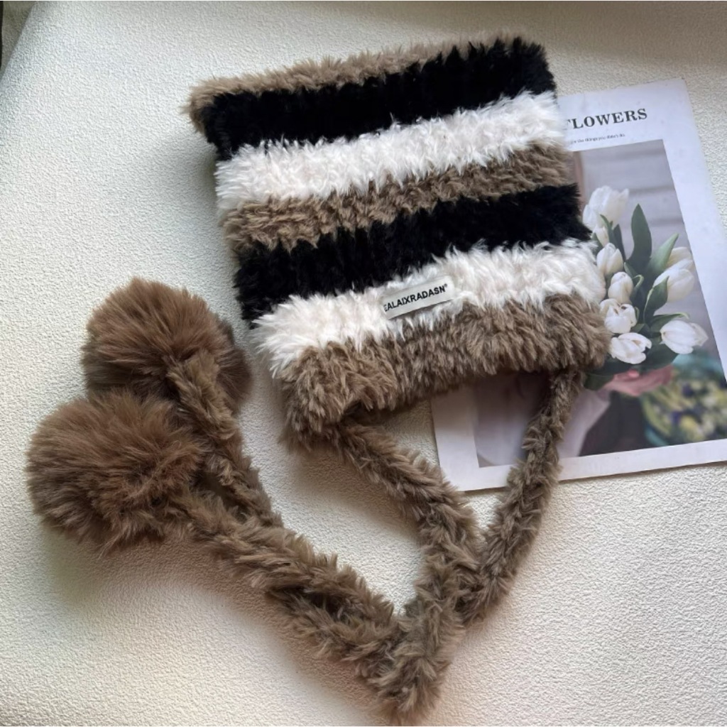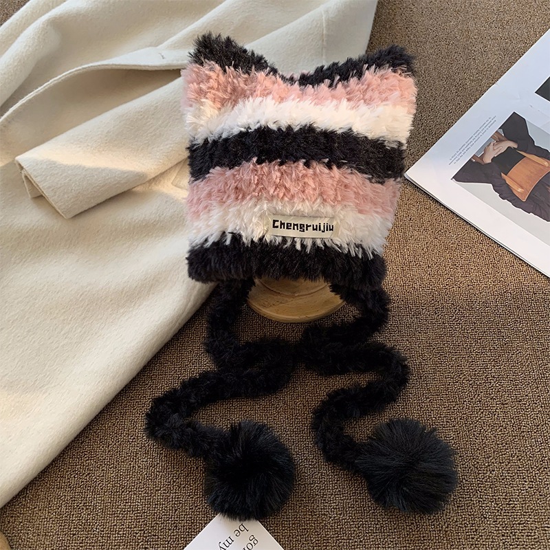 FUXI 毛絨帽子女 毛線帽 日系撞色條紋帽子 秋冬保暖護耳帽 可愛貓耳朵帽子 女裝 帽子兩用可做斜背包包三色帽-黑白粉|三色帽-粉黃灰|三色帽-棕白卡|三色帽-卡白黑FUXI 服喜行