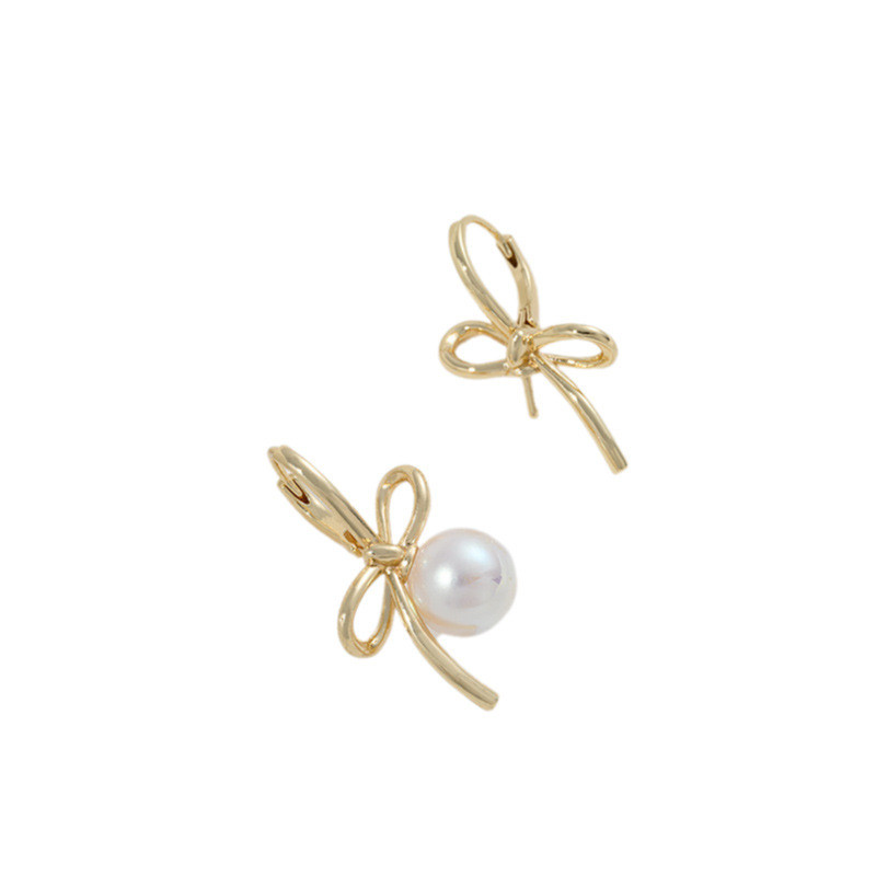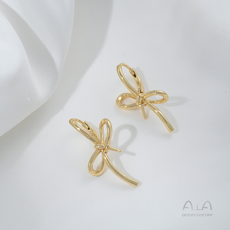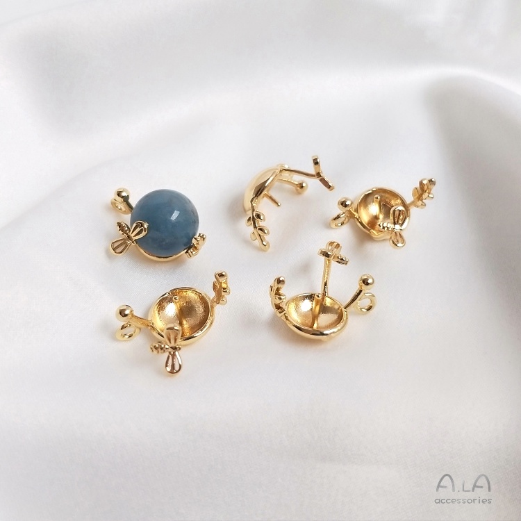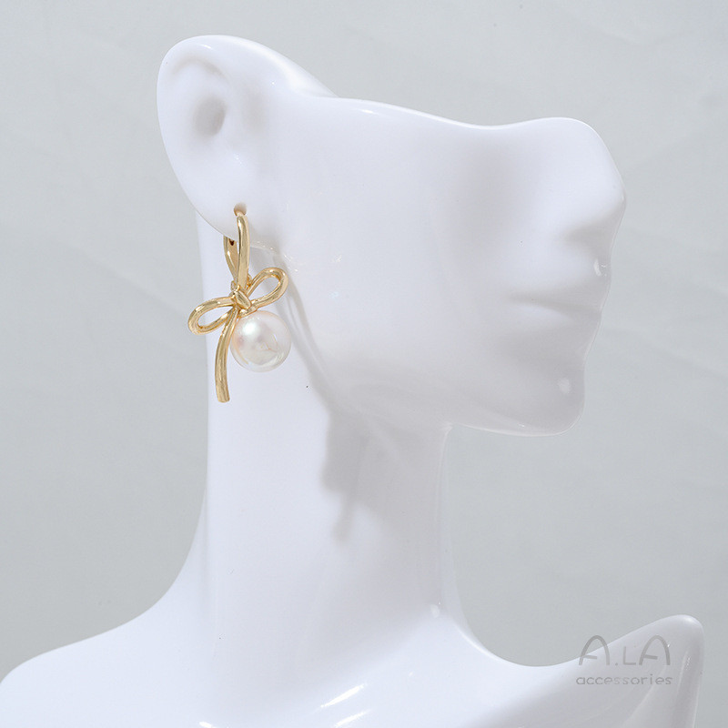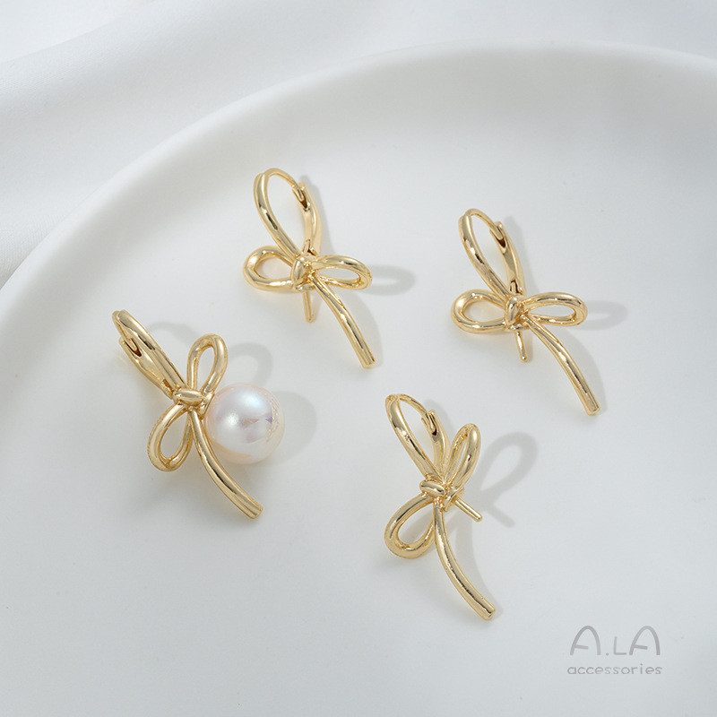 宏雲Hongyun-Ala新品-14K包金保色線條蝴蝶結半孔珠托耳扣diy手作粘珍珠耳環耳飾品資料蝴蝶結珠托耳扣1對2只左右款各1只HongYun飾品配件批發零售