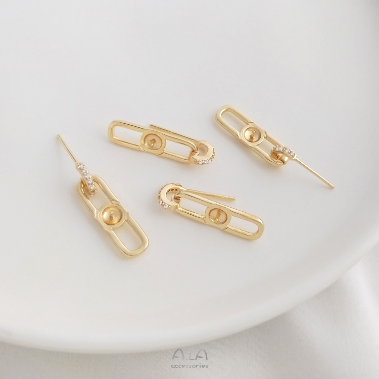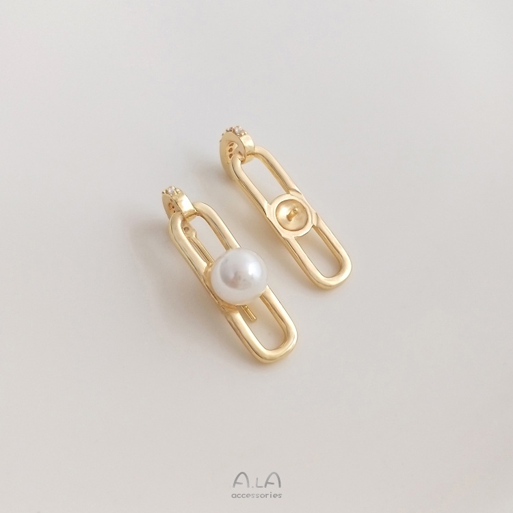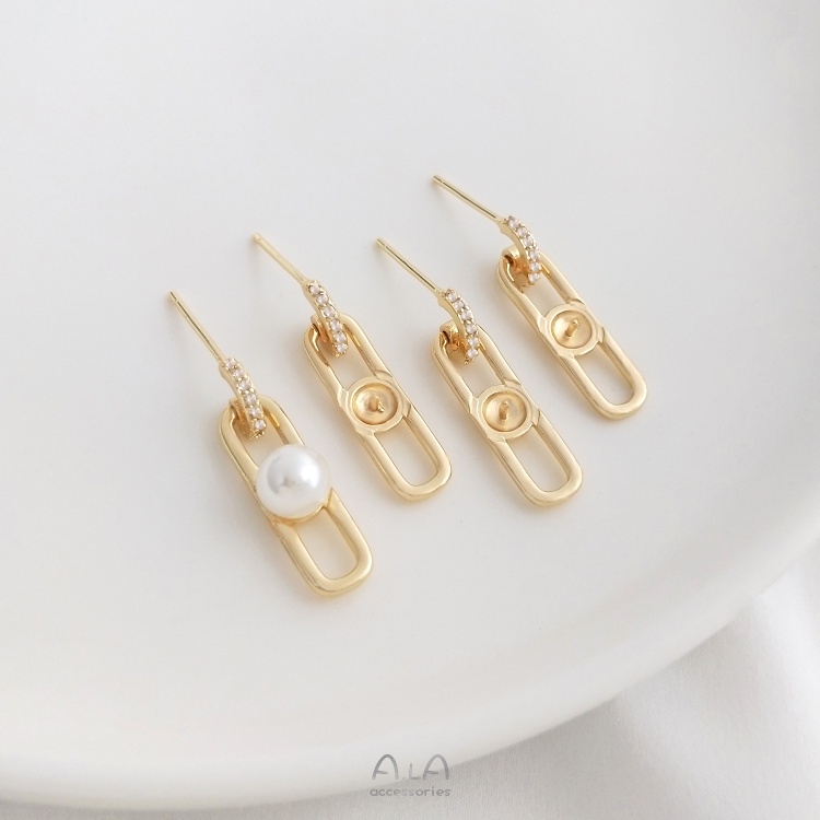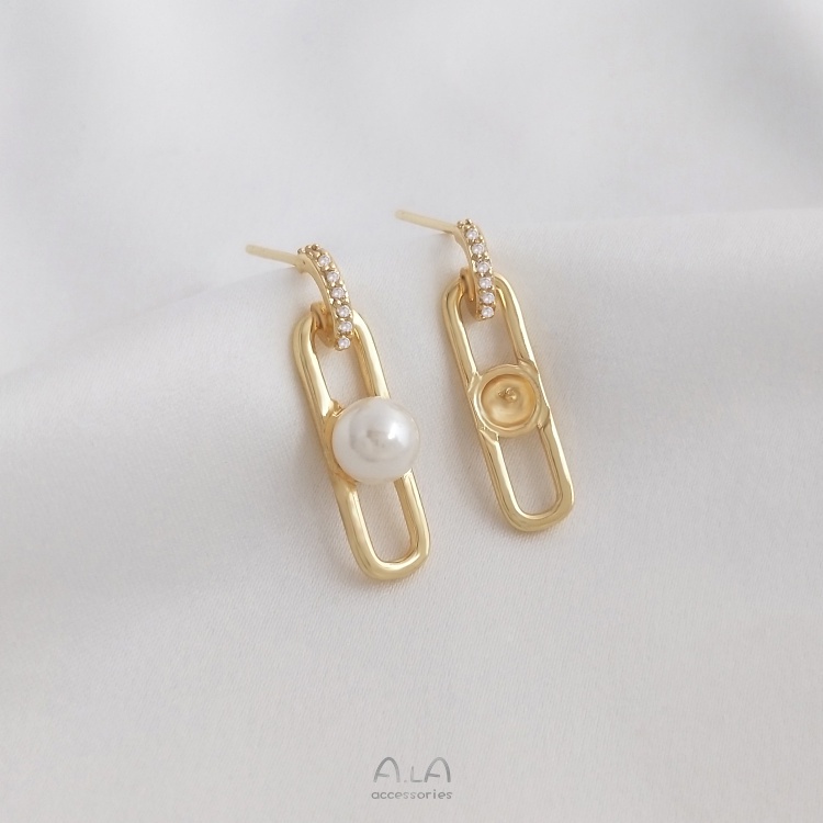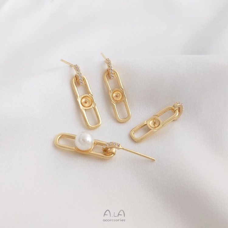 宏雲Hongyun-Ala—925銀針14K包金幾何長O形鑲鋯珠托耳釘手工diy珍珠耳飾品耳環配件幾何長0形珠托銀針耳釘HongYun飾品配件批發零售