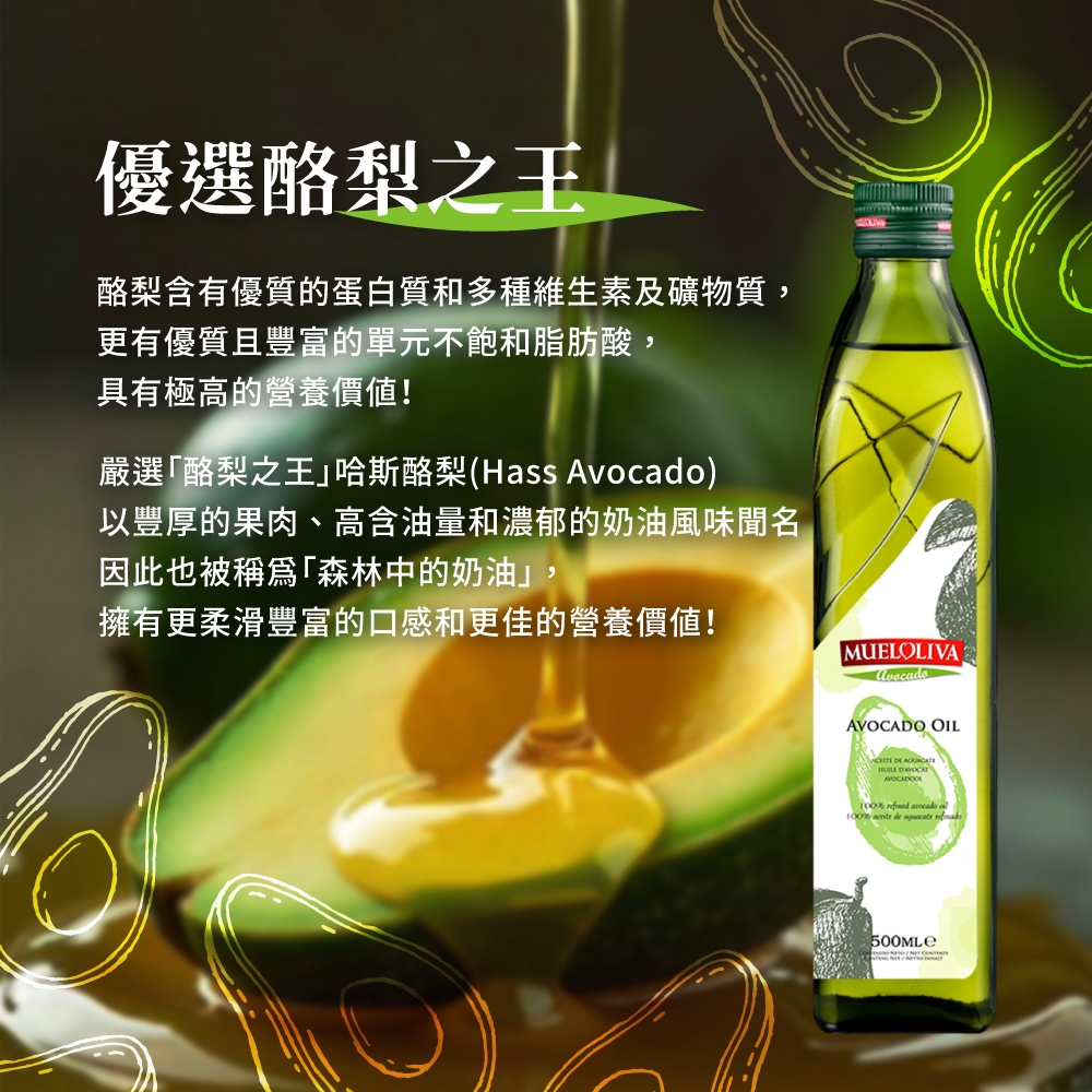 【MUELOLIVA 茉麗華】西班牙嚴選 頂級酪梨油 西班牙原瓶進口(500ml*6入) (團購組合)【MUELOLIVA 茉麗華】西班牙嚴選 頂級酪梨油 西班牙原瓶進口(500ml*6入) (團購組合)OilGoodSome 陳桑灶咖|滿福實業