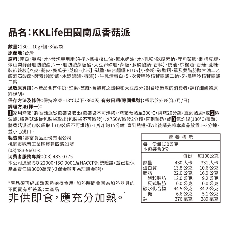 【KKLife】田園南瓜香菇派 (130±10g/個;3個/袋)田園南瓜Frozen Processed FoodKKLife|紅龍官方直營店