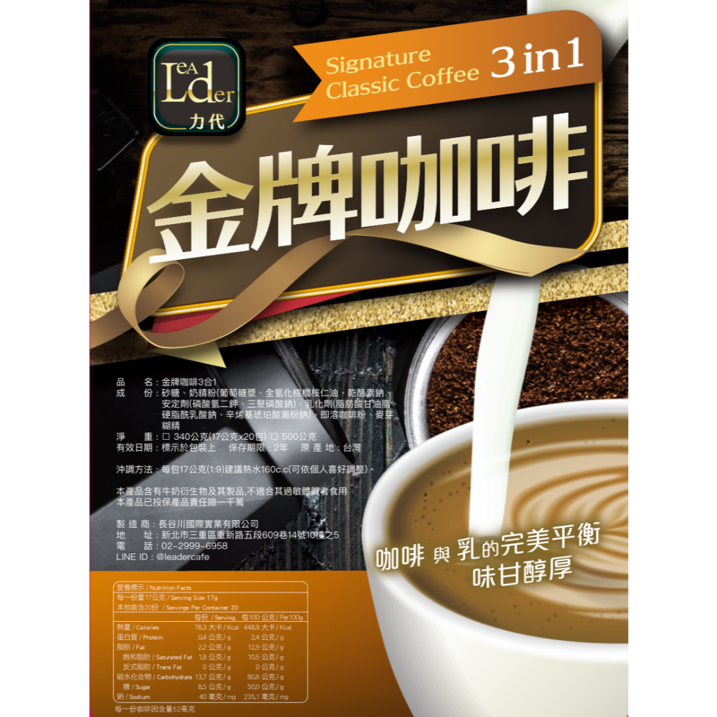 【力代】 即溶咖啡三合一「力代金牌拿鐵」【含糖】500g 即溶咖啡 三合一咖啡 拿鐵咖啡【力代】 即溶咖啡三合一「力代金牌拿鐵」【含糖】500g 即溶咖啡 三合一咖啡 拿鐵咖啡CoffeeLeader 力代咖啡飲品