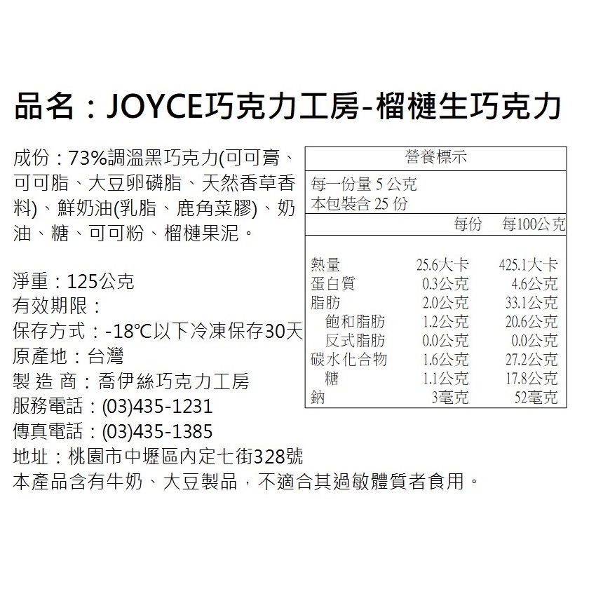 Joyce Chocolate 榴槤忘返生巧克力禮盒(25顆/盒)