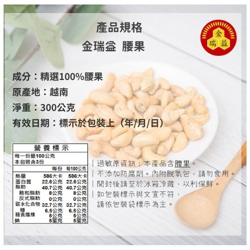 【金潤益】原味 腰果 300g 夾鏈包裝|天然 堅果 腰果仁 低溫烘焙|金瑞益腰果 300g|夾鏈包裝2026/03NutsKREFOOD金潤益食品官方旗艦店