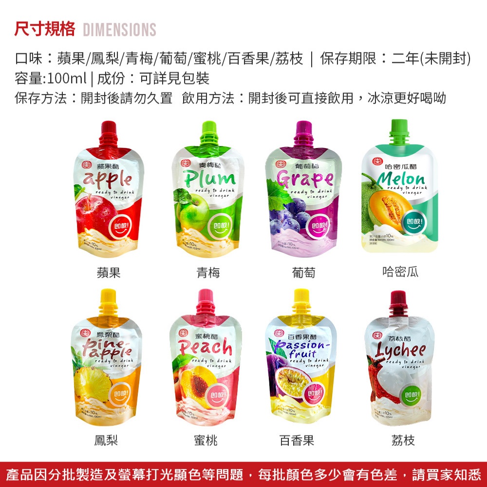 十全果醋 青梅醋 鳳梨醋 果醋果 葡萄醋 即飲醋 水果醋01.青梅醋(100ml單包)|02.蘋果醋(100ml單包)|03.葡萄醋(100ml單包)|04.鳳梨醋(100ml單包)|05.蜜桃醋(100ml單包)|06.百香果醋(100ml單包)|07.荔枝醋(100ml單包)|08.哈密瓜(100ml單包)Juice & Juice VinegarLAVIDA 育兒好好玩!