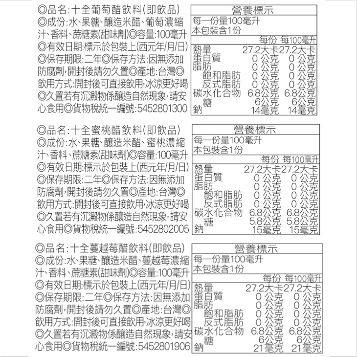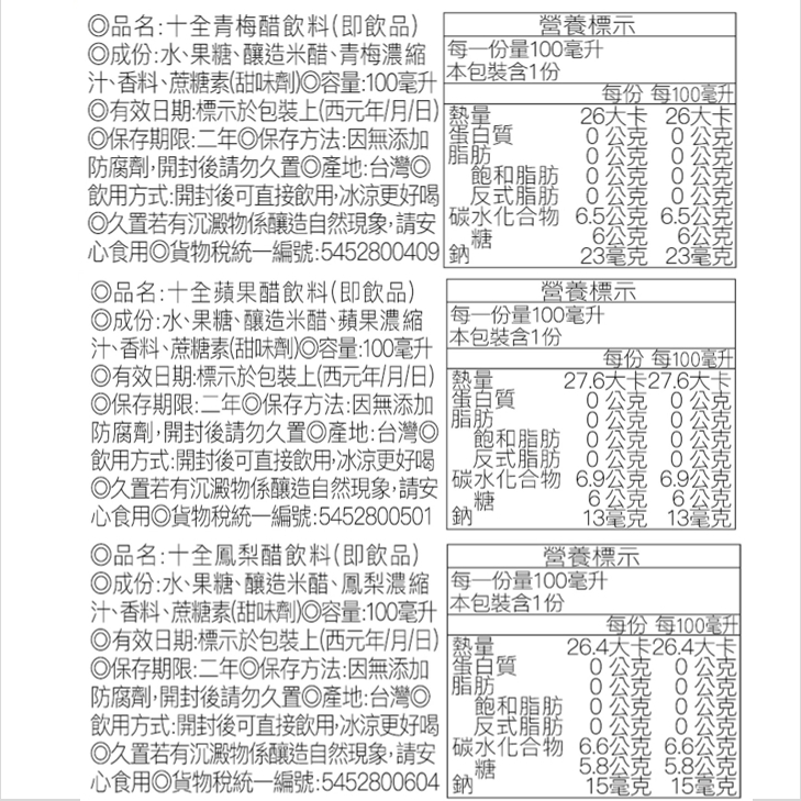 十全果醋 青梅醋 鳳梨醋 果醋果 葡萄醋 即飲醋 水果醋