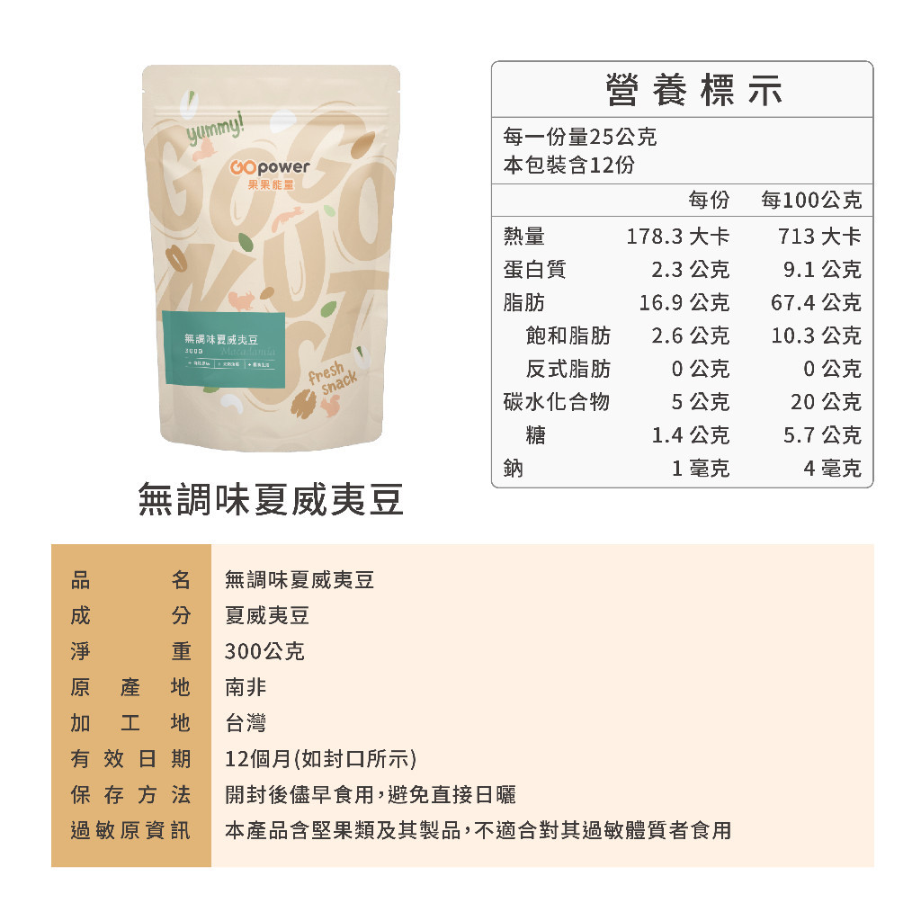 果果能量 無調味夏威夷豆 (300g/包)|果果能量官方旗艦店300克NutsGOpower果果能量官方店