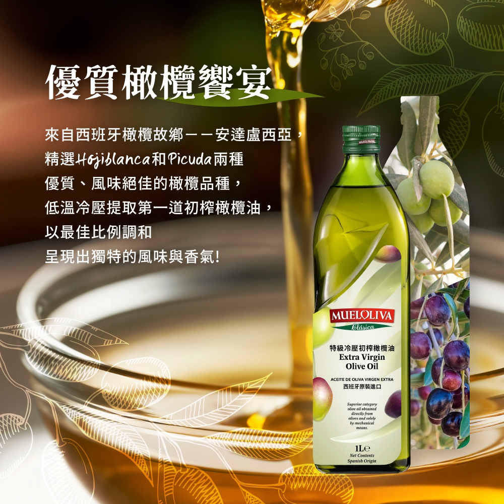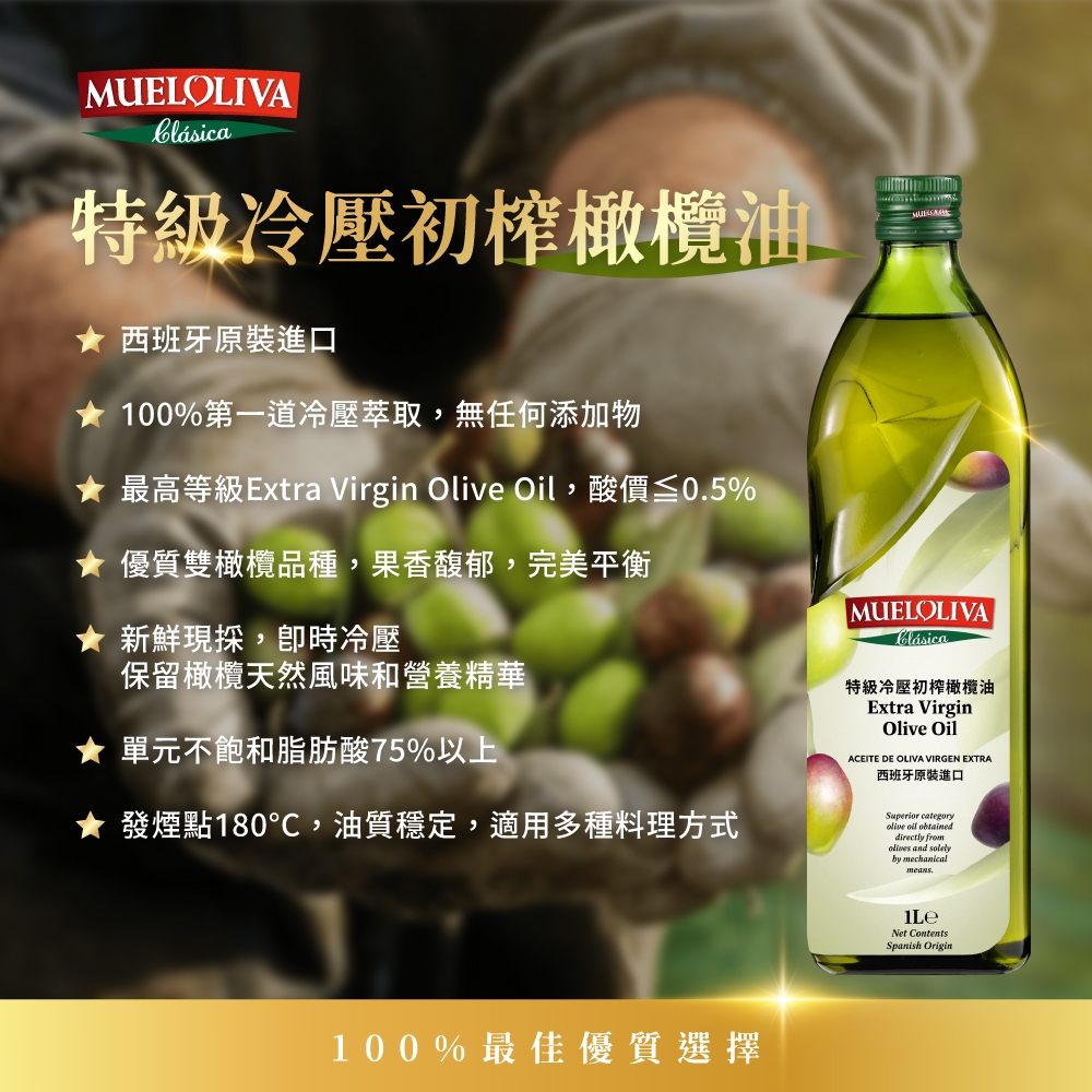 【MUELOLIVA 茉麗華】特級冷壓初榨橄欖油 西班牙原瓶進口(1000ml*6入) (團購組合)【MUELOLIVA 茉麗華】特級冷壓初榨橄欖油 西班牙原瓶進口(1000ml*6入) (團購組合)OilGoodSome 陳桑灶咖|滿福實業