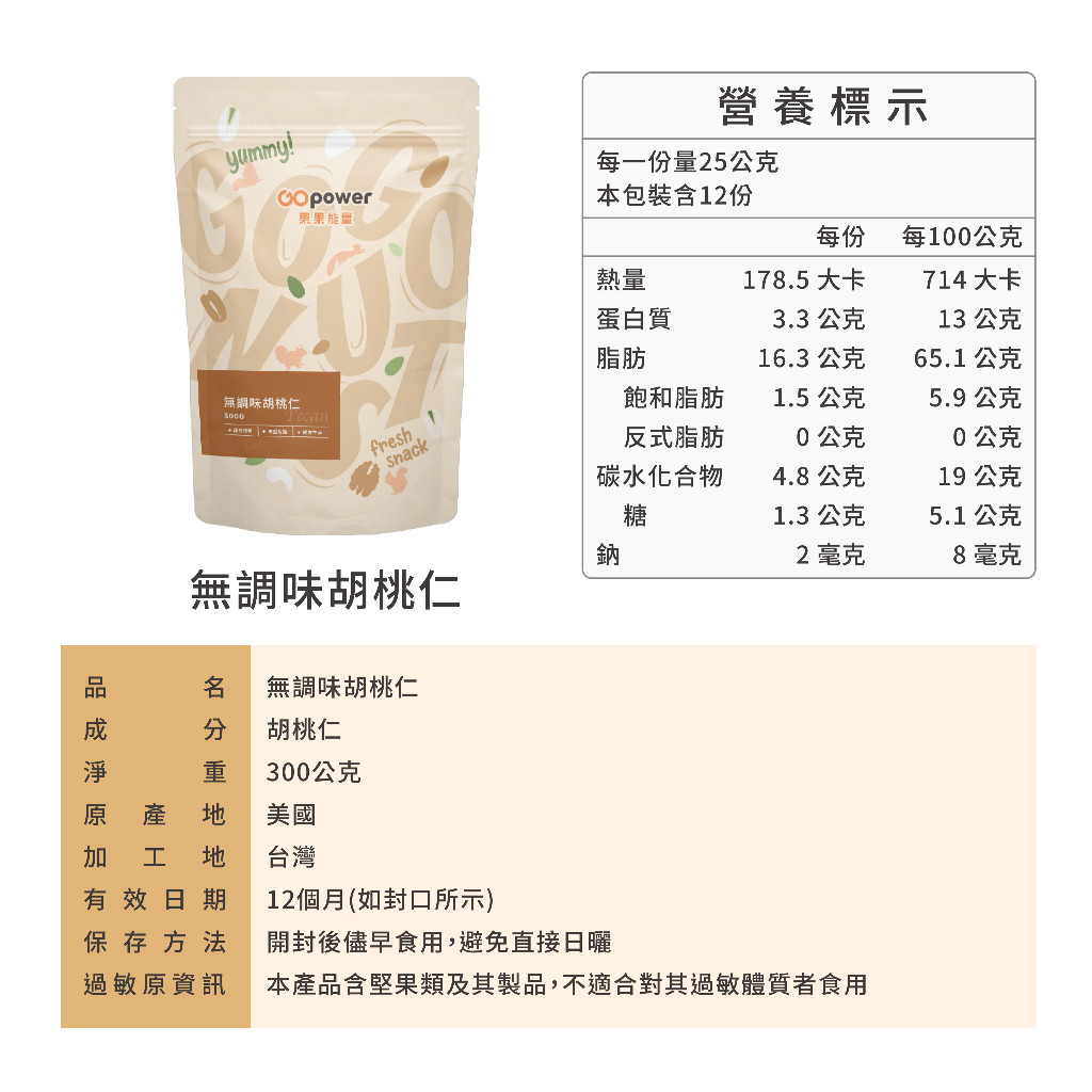 果果能量 無調味胡桃仁 (300g/包)|果果能量官方旗艦店300克NutsGOpower果果能量官方店
