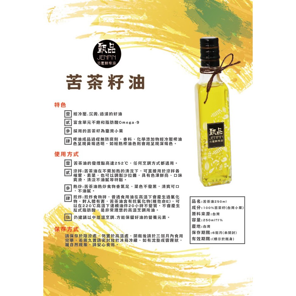甄品油舖 冷壓鮮榨油 臺灣小果苦茶油250ml 接單後現榨苦茶籽油250ml(臺灣小果)|苦茶籽油250ml(臺灣小果)*2瓶|苦茶籽油250ml(臺灣小果)*3瓶Oiljenpin_oil 甄品油舖