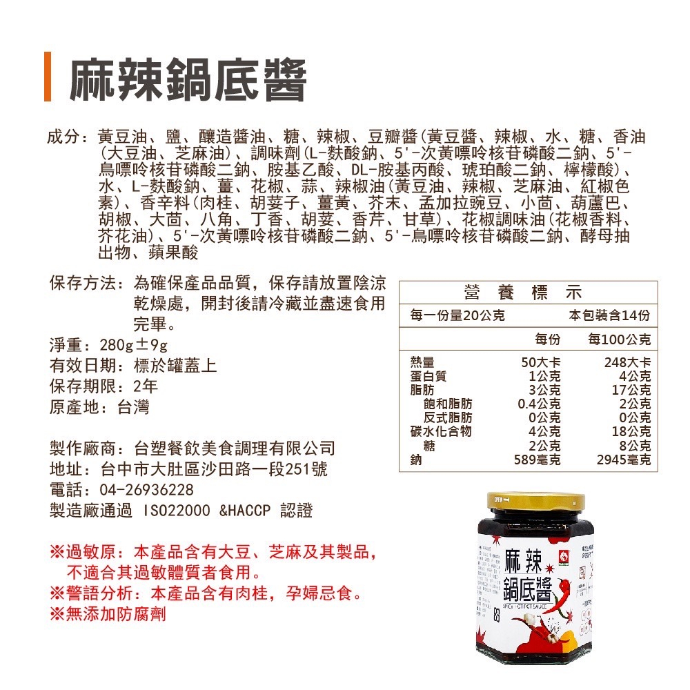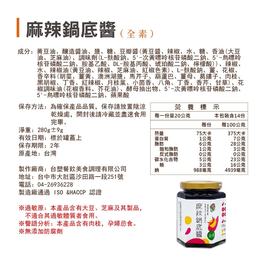 台塑餐飲 全素麻辣鍋底醬/麻辣鍋底醬 280g罐裝 [JENPIN饌]全素麻辣鍋底醬|麻辣鍋底醬Seasonings & Condimentsjenpin_oil 甄品油舖