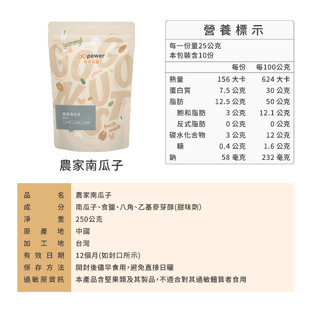 果果能量 農家帶殼南瓜子 (250g/包)|果果能量官方旗艦店250克SeedsGOpower果果能量官方店