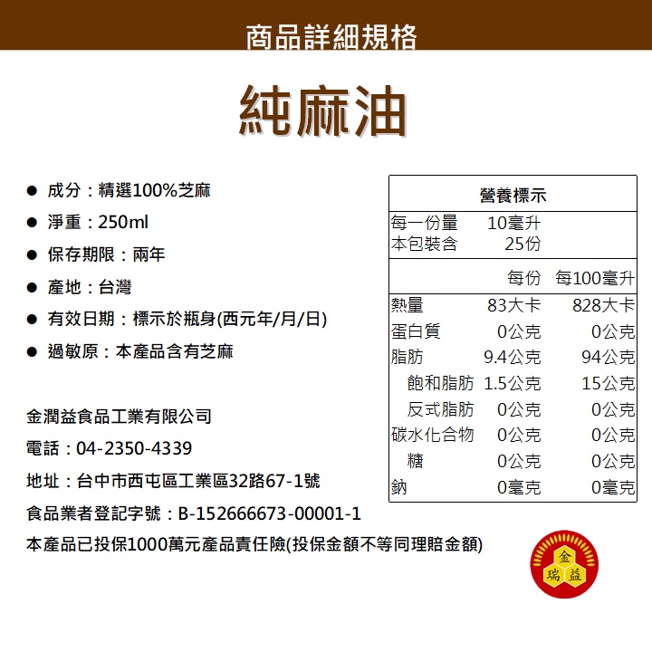 【金潤益】純麻油 250ml|頂級 芝麻油 純芝麻油 麻油 黑麻油 純的|坐月子 進補|金瑞益 油品純麻油250ml*2瓶|2026/03OilKREFOOD金潤益食品官方旗艦店