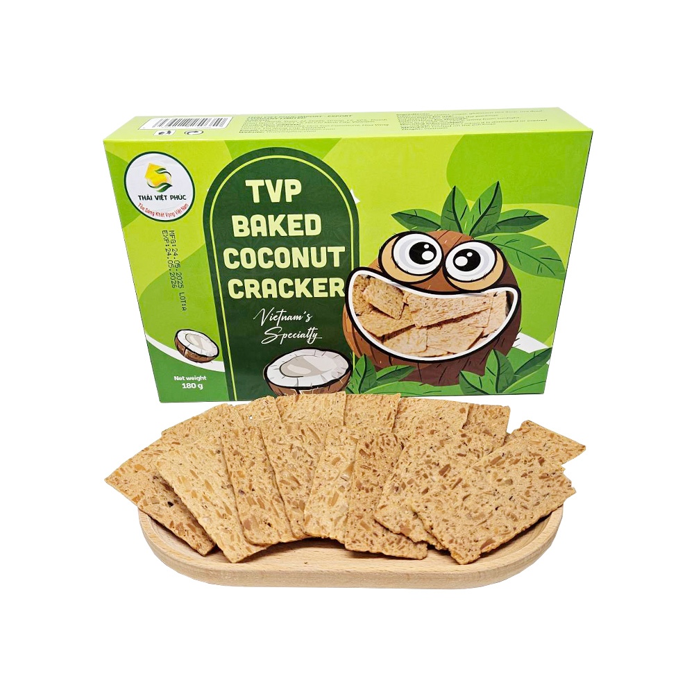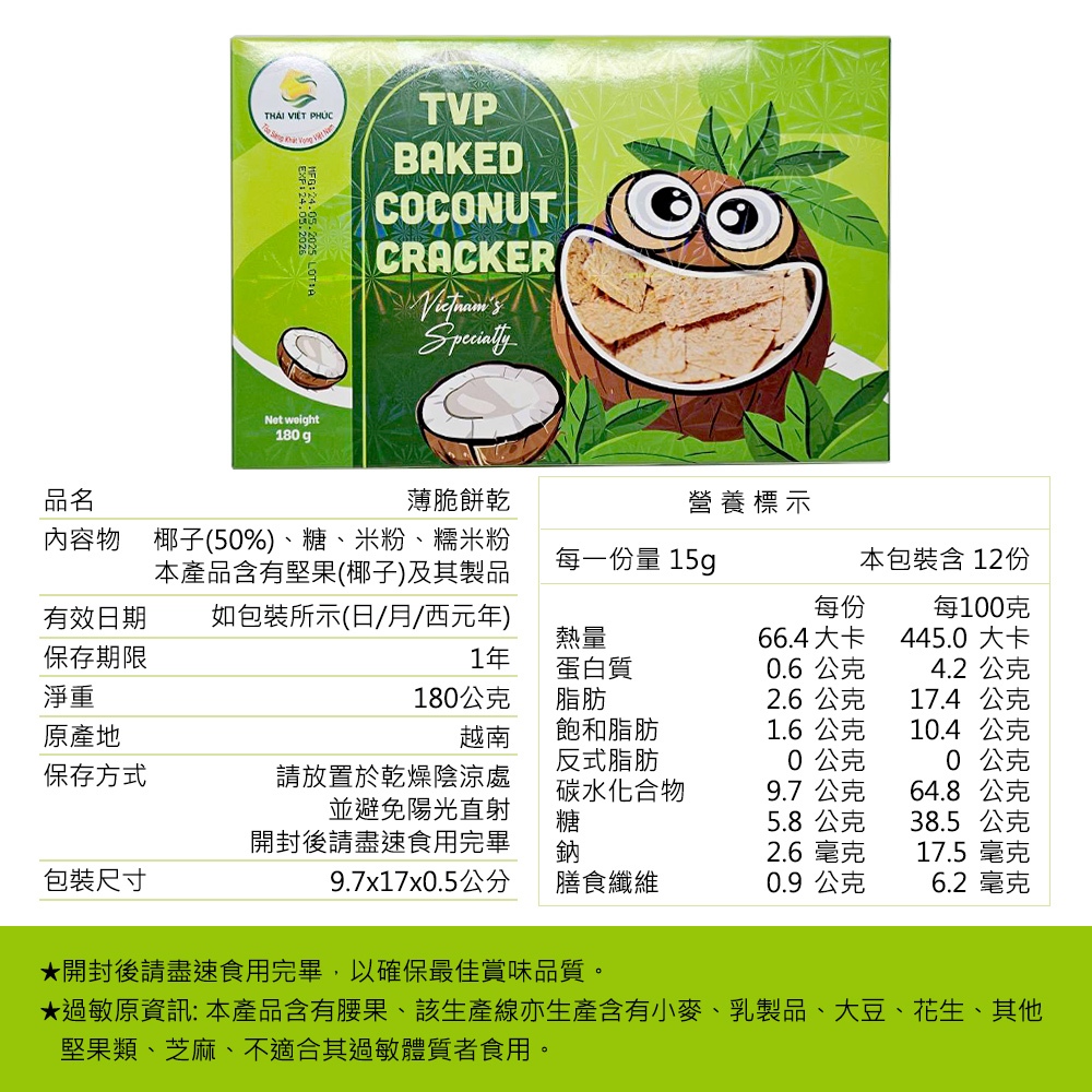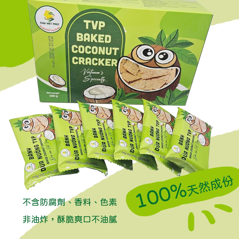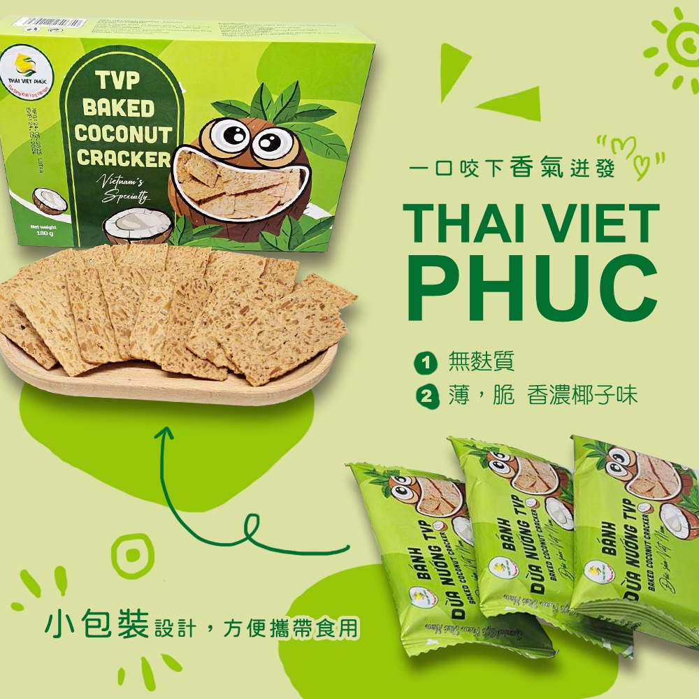 【THAI VIET PHUC】泰越福 烘烤椰子薄脆餅乾180g-12包/盒 無麩質,薄,脆 香濃椰子味一口咬下