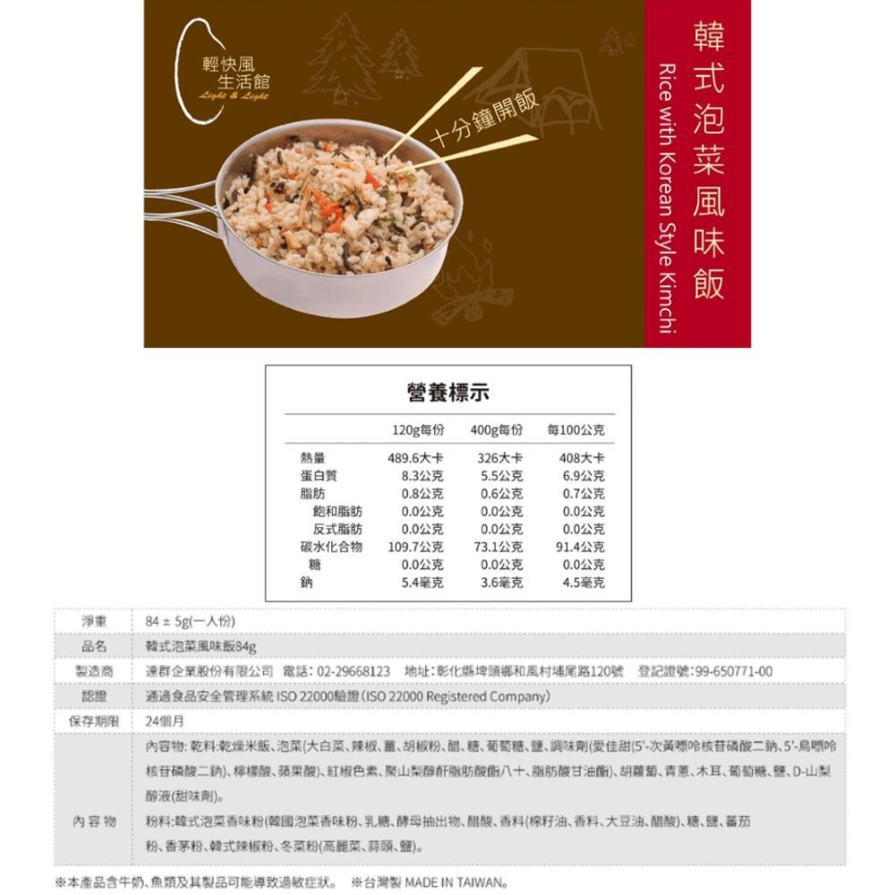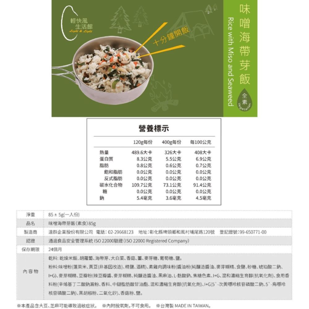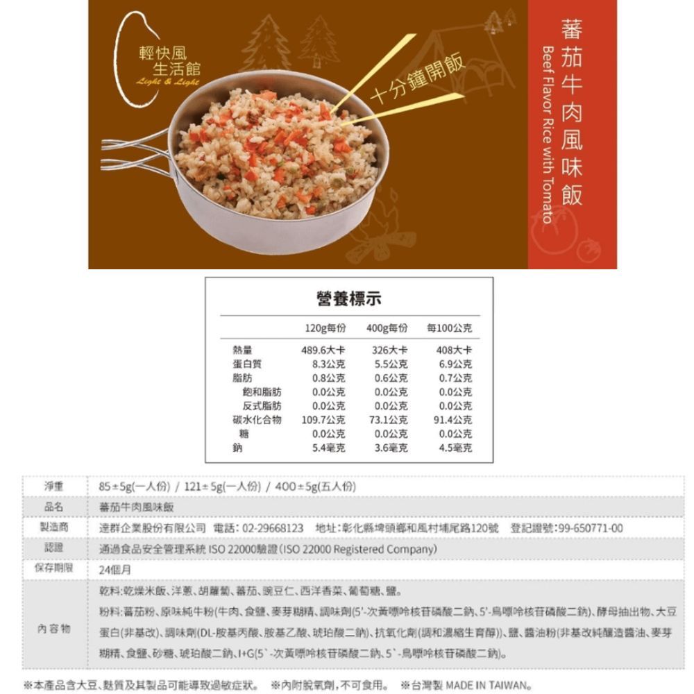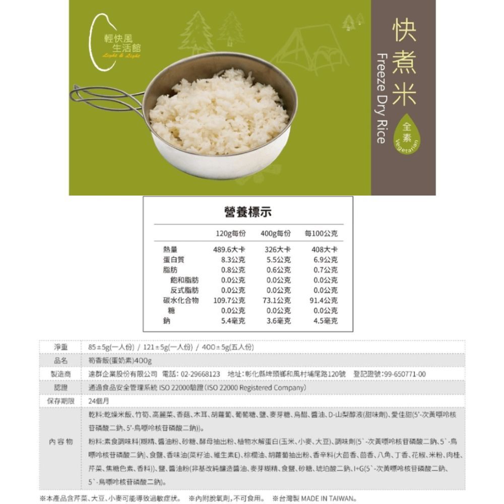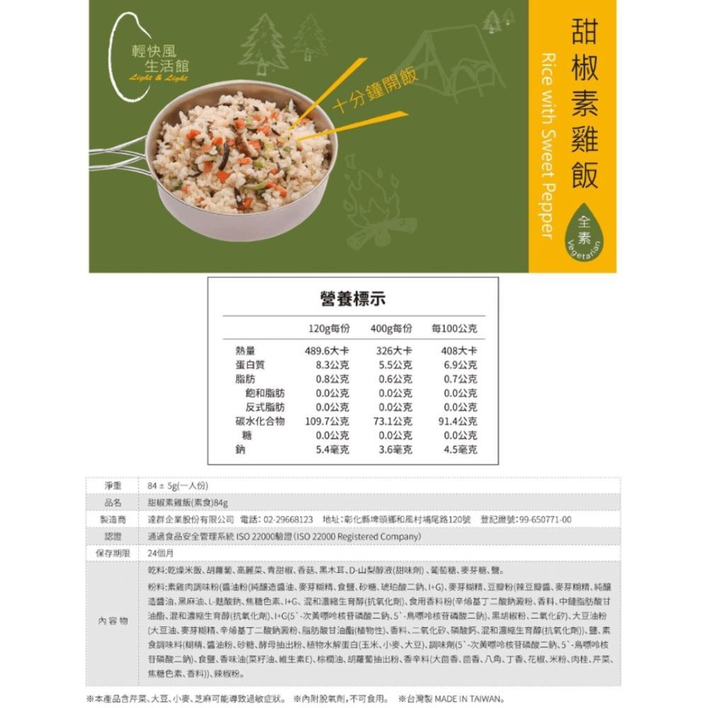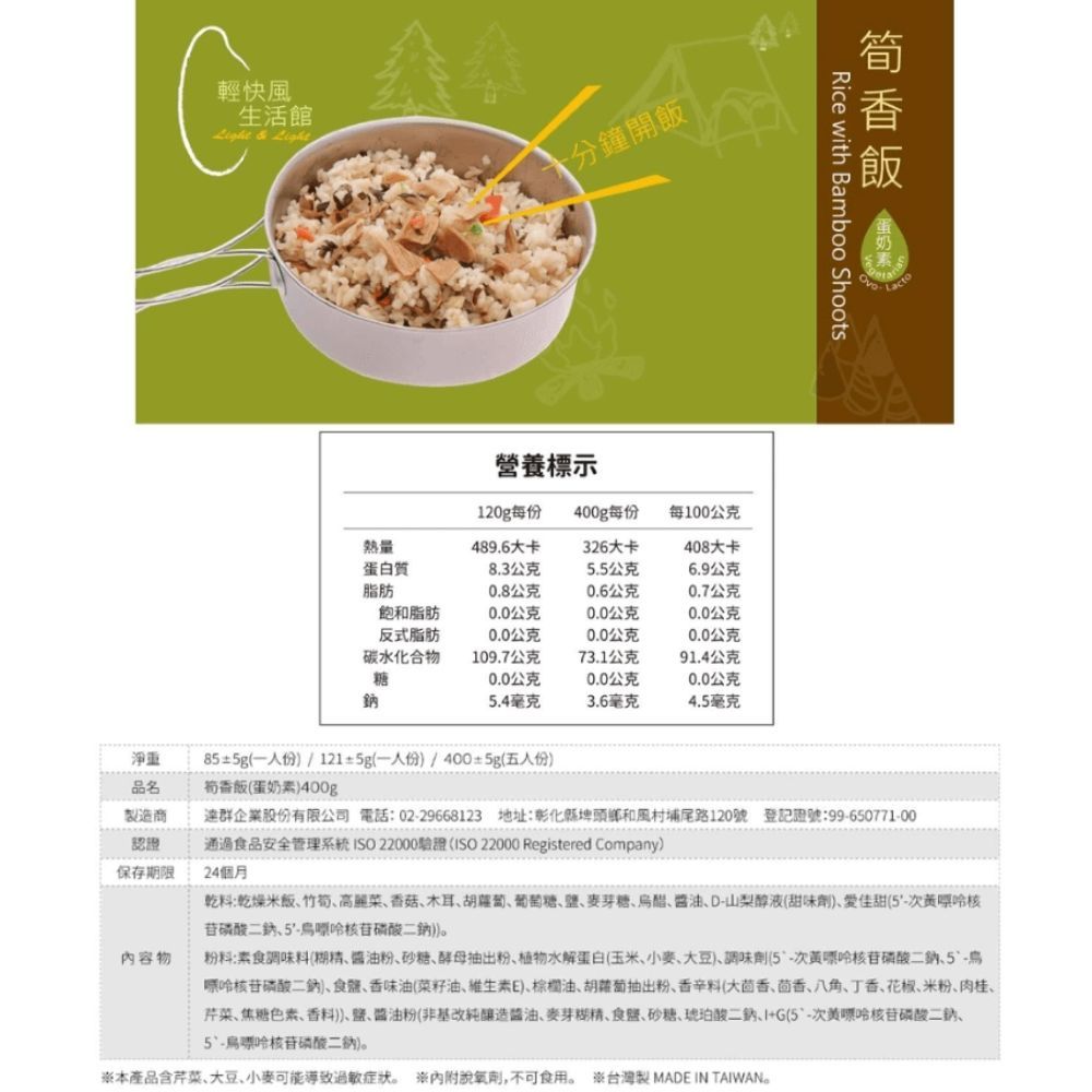 輕快風背包客廚房 防災備糧/乾燥飯/登山糧食【一次買10包,現折$30】椒麻植蔬飯,85±5g(一人份)|椒麻植蔬飯,121±5g(一人份)|椒麻植蔬飯,400±5g(五人份)|脆筍油蔥飯,85±5g(一人份)|脆筍油蔥飯,121±5g(一人份)|脆筍油蔥飯,400±5g(五人份)|咖哩飯,85±5g(一人份)|咖哩飯,121±5g(一人份)|咖哩飯,400±5g(五人份)|蕃茄牛肉風味飯,85±5g(一人份)|蕃茄牛肉風味飯,121±5g(一人份)|蕃茄牛肉風味飯,400±5g(五人份)|韓式泡菜風味飯,85±5g(一人份)|韓式泡菜風味飯,121±5g(一人份)|韓式泡菜風味飯,400±5g(五人份)|筍香飯(蛋奶素),85±5g(一人份)|筍香飯(蛋奶素),121±5g(一人份)|筍香飯(蛋奶素),400±5g(五人份)|味噌海帶芽飯(素食可食),85±5g(一人份)|味噌海帶芽飯(素食可食),121±5g(一人份)|味噌海帶芽飯(素食可食),400±5g(五人份)|甜椒素雞飯(素食可食),85±5g(一人份)|甜椒素雞飯(素食可食),121±5g(一人份)|甜椒素雞飯(素食可食),400±5g(五人份)|田園起司飯,85±5g(一人份)|田園起司飯,121±5g(一人份)|田園起司飯,400±5g(五人份)|白飯,85±5g(一人份)|白飯,121±5g(一人份)|白飯,400±5g(五人份)Instant Rice & PorridgeHME戶外裝備