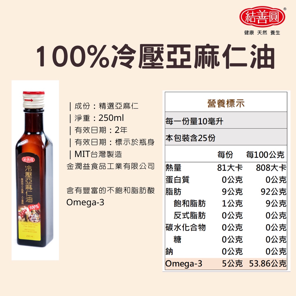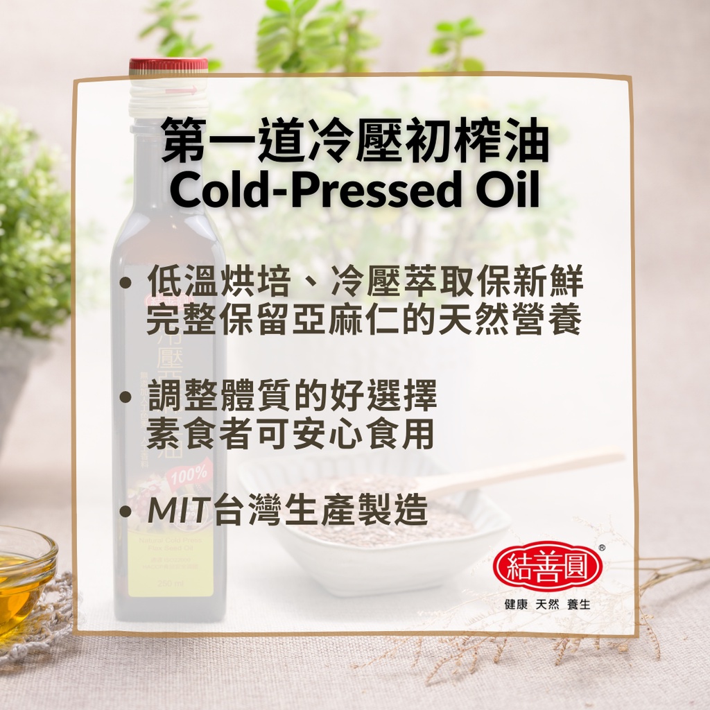 【結善圓】冷壓亞麻仁油 250ml|亞麻仁籽油 亞麻仁油 亞麻仁|第一道 冷壓 初榨 冷壓油 油品冷壓亞麻油250ml | 202603OilKREFOOD金潤益食品官方旗艦店