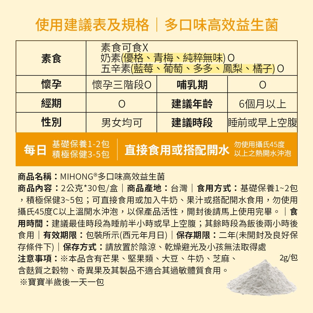 MIHONG米鴻生醫 高效 益生菌 + 酵素 (30包/盒) 15菌3000億百大蔬果 保健食品②優格(經典原味) x1盒|③橘子(熟潤柑香) x1盒|④鳳梨(金讚鳳梨) x1盒|⑤青梅(鮮萃青梅) x1盒|⑥葡萄(可口葡萄) x1盒|⑦藍莓(酸甜藍莓) x1盒|① 純粹無味x1盒(無人工色素無人工香料|⑧多多(童年多多) x1盒Well BeingMIHONG® 米鴻生醫