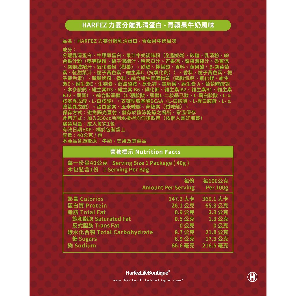 Harfez力宴 分離乳清蛋白 青蘋果牛奶風味30包|60包FitnessHarfez Fitness 力宴健身官方旗艦店