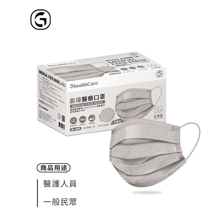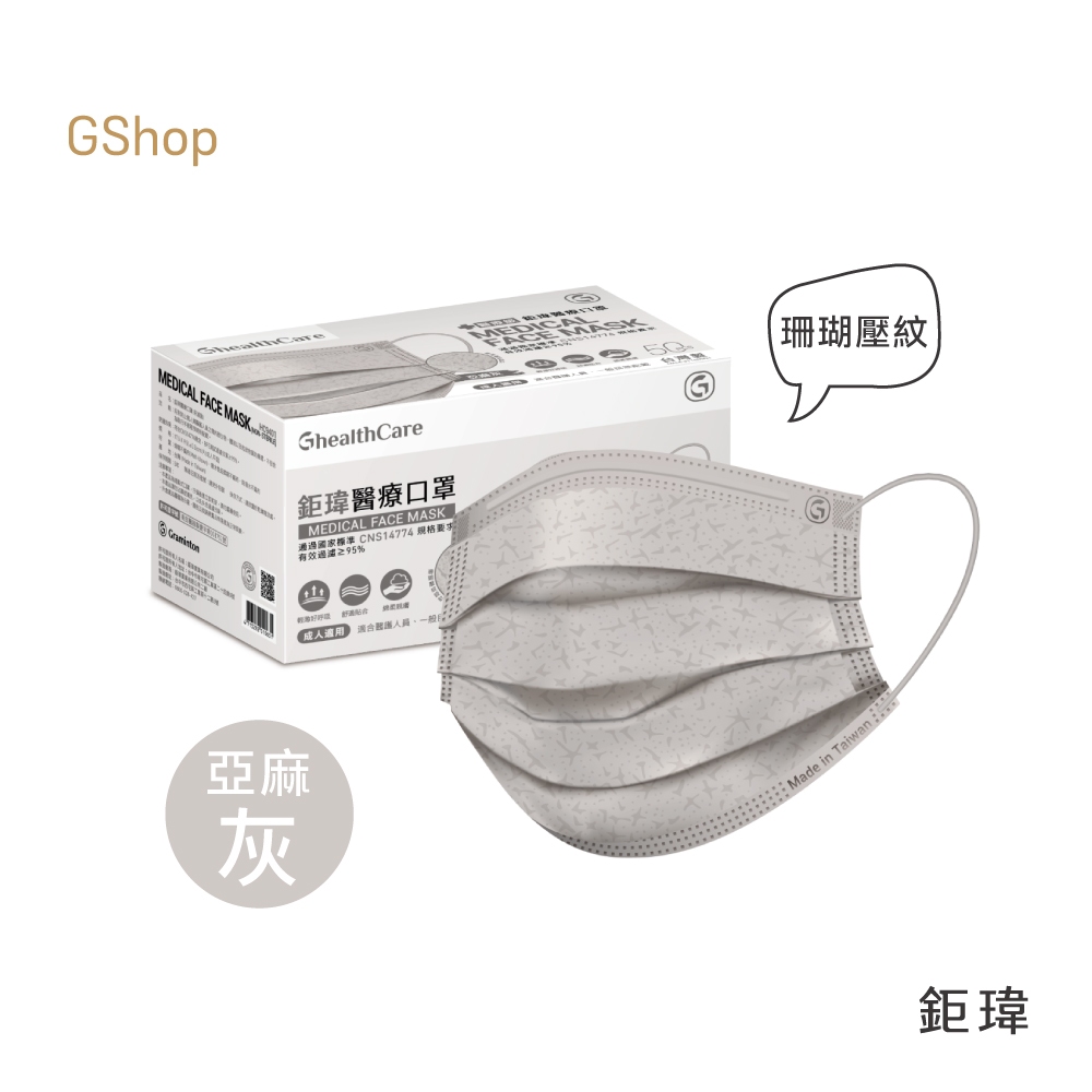 鉅瑋【珊瑚壓紋醫療口罩-亞麻灰】(50片/盒) 灰色口罩 霧灰 拋棄式口罩 平面口罩 成人口罩 鉅瑋口罩 醫療口罩 鉅瑋亞麻灰|50片/盒Medical Gloves & MasksGShop|鉅瑋官方直營店
