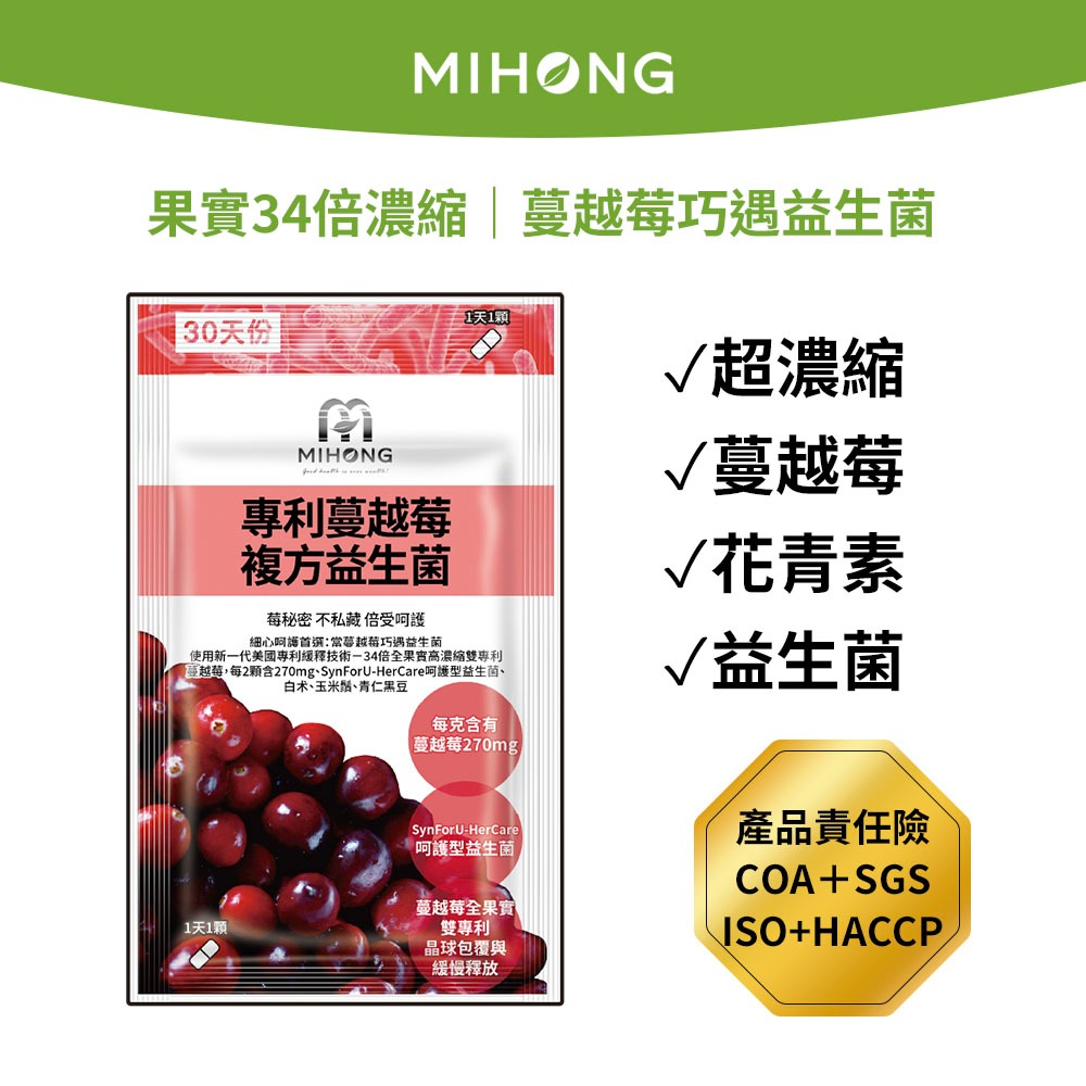 MIHONG米鴻生醫 專利 蔓越莓 益生菌 – 細心呵護首選(30顆/包) 現貨 蔓越莓益生菌 專利高濃度蔓越莓益生菌 x1包 ✅加數量更優惠✅Well BeingMIHONG® 米鴻生醫