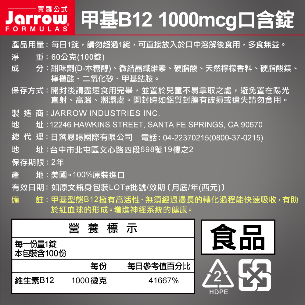 (即期品)Jarrow賈羅公式 甲基B12 1000mcg口含錠(100錠/瓶)_效期2025/11/30【官方旗艦店】單瓶(效期2025/11/30)|3瓶組(效期2025/11/30)|2瓶組(效期2025/11/30)|6瓶組(效期2025/11/30)Well BeingJarrow賈羅公式 x Nature’s Truth綠萃淨 | 官方直營
