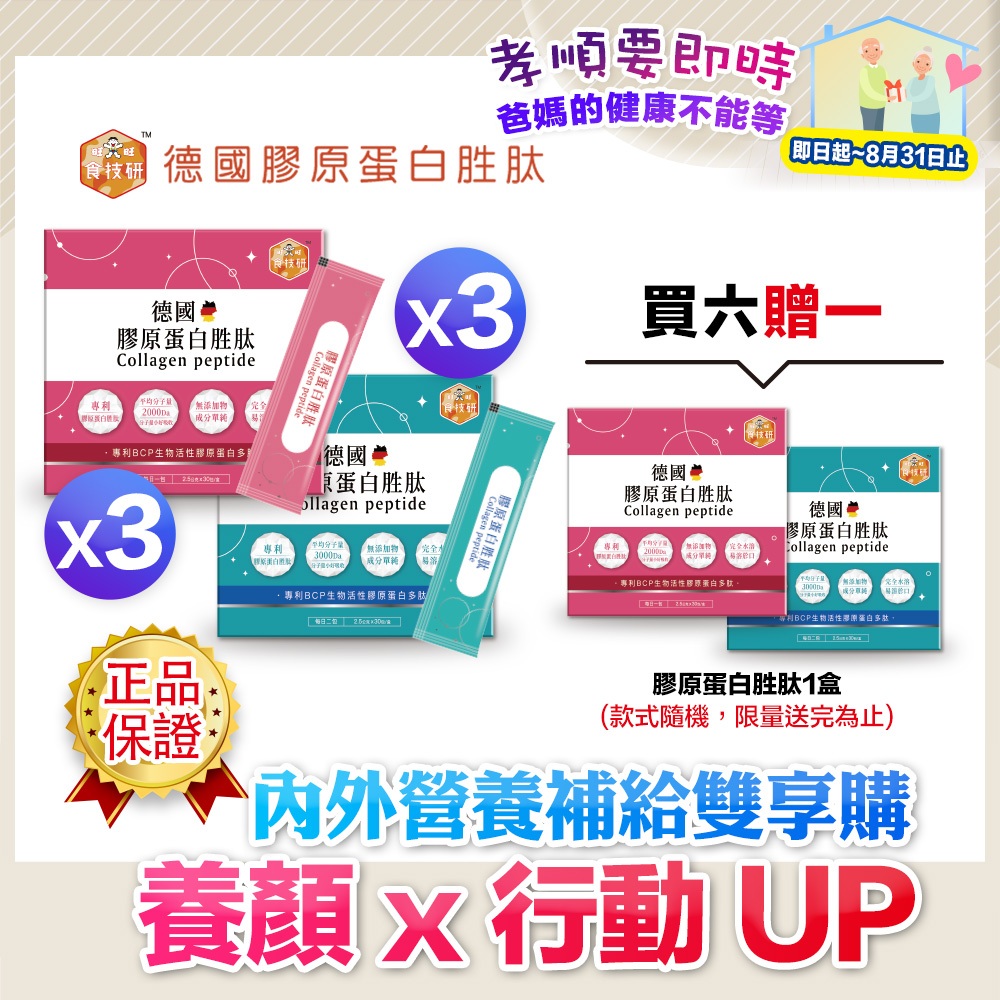 孝親限定【食技研】德國專利膠原蛋白胜肽六盒特惠組(2.5g*30包/盒) | 內外營養補給雙享購 | 美麗x活力雙享6盒(養顏+行動力)贈膠原1盒隨機|養顏美容*6盒 贈膠原蛋白1盒(隨機)|增強行動力*6盒 贈膠原蛋白1盒(隨機)Well BeingHurrybuy快點購旗艦店