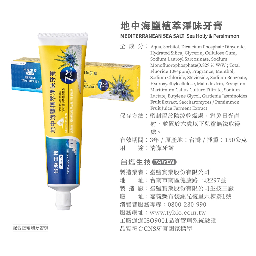 台鹽 地中海鹽植萃淨味牙膏(150g/條)地中海鹽植萃Oral CareMIPA 生活百貨