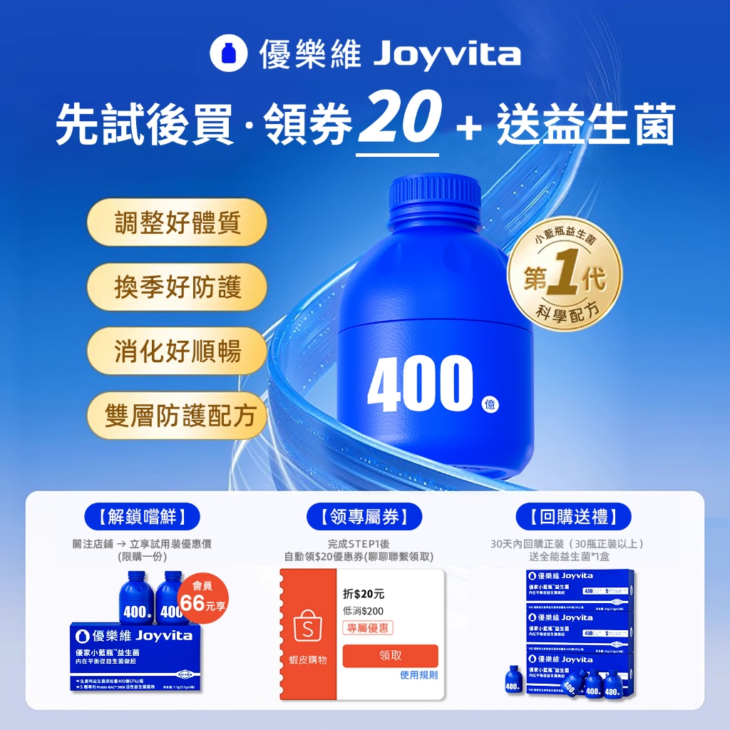 【優先試用】JoyVita優樂維 小藍瓶400億活力益生菌 全能 高效益生菌 調理消化 全家安心享全能益生菌 3瓶/盒(嚐鮮裝)Well BeingJoyvita 優樂維|益生菌專家|保健品牌旗艦店