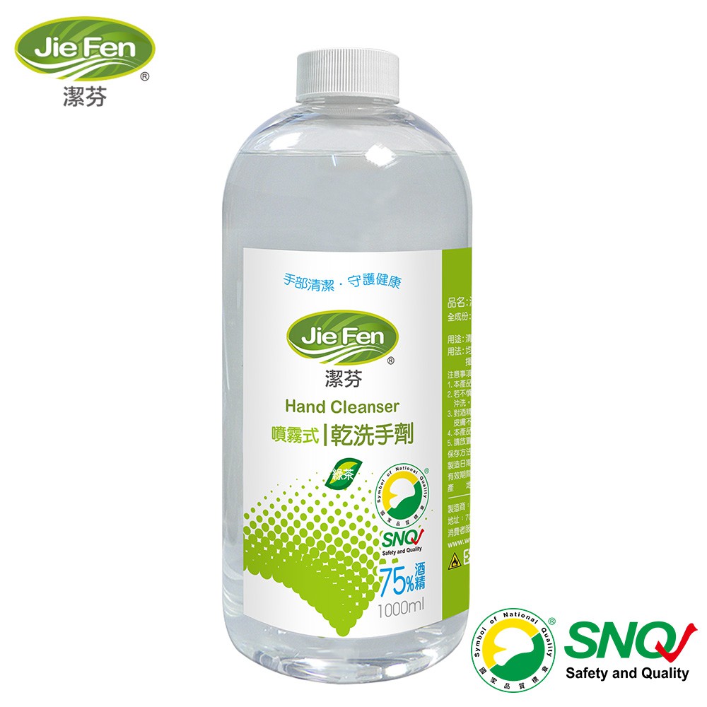 【Jie Fen潔芬】75%酒精乾洗手劑-1000ml填充瓶 綠茶精油 SNQ認證【Jie Fen潔芬】75%酒精乾洗手劑-1000ml填充瓶 綠茶精油 SNQ認證Hand SanitizersJie Fen潔芬官方旗艦店