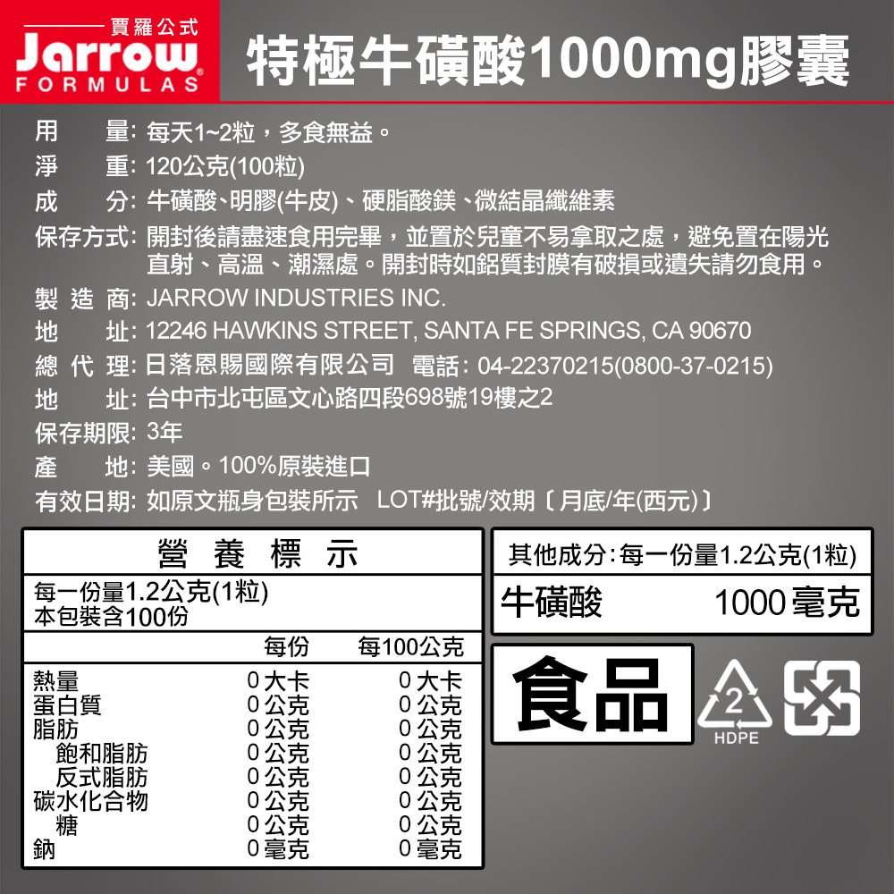 Jarrow賈羅公式 特極牛磺酸1000mg膠囊(100粒/瓶)【官方旗艦店】6瓶組|單瓶|2瓶組|3瓶組|NG品-單瓶(瓶身微凹)Well BeingJarrow賈羅公式 x Nature’s Truth綠萃淨 | 官方直營