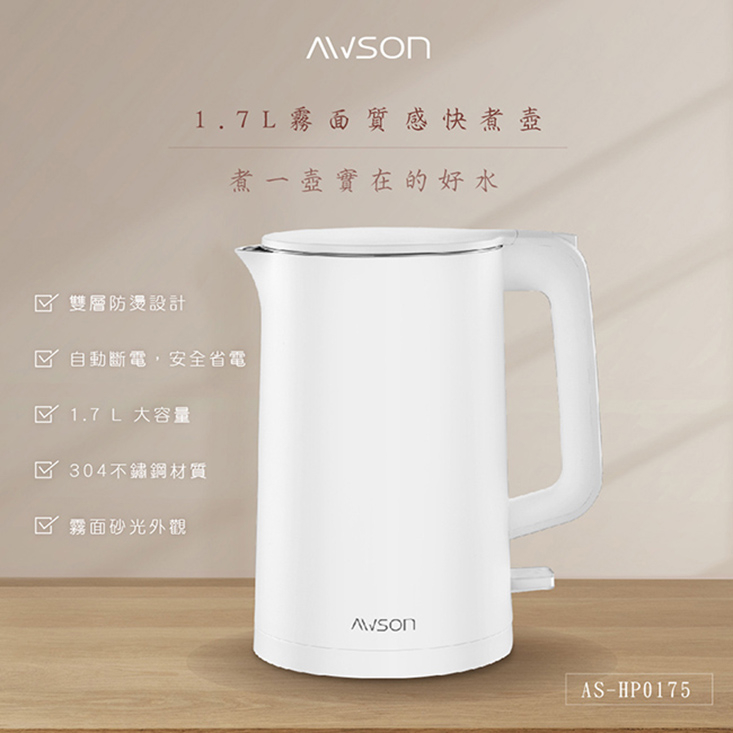 【煮一壺好水】AWSON 歐森304不鏽鋼快煮壺 電熱快煮壺 旅行快煮壺 雙層防燙 泡茶壺 熱水壺 電茶壺1.7L雙層防燙不鏽鋼快煮壺-櫻花粉|1.7L雙層防燙不鏽鋼快煮壺-月光白|1.7L雙層防燙不鏽鋼快煮壺-極致黑|1.7L雙層防燙不鏽鋼快煮壺-小麥田|超商最多2台,超過請選賣家宅配大宗物件KettlesMECOOL多媒體影音家用電器專賣旗艦館