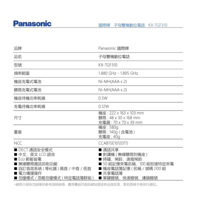 Panasonic 國際牌 子母雙機數位電話 KX-TGF310TWMPanasonic 國際牌 子母雙機數位電話 KX-TGF310TWMTelephonesH-T-T旗艦館