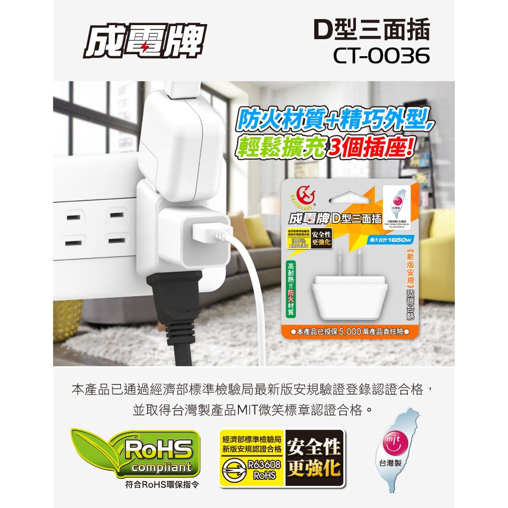 成電牌 D型三面插(CT-0036)成電牌 D型三面插(CT-0036)Electric Sockets & Extension CordsiPlus+保護傘延長線品牌館