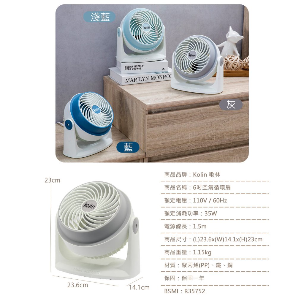 【kolin歌林】6吋空氣循環扇 KFC-MN621 風扇 電風扇 AC扇便攜式風扇 空調扇 空氣循環扇 迷你風扇灰|淺藍|藍CoolingH MOD髮摩 品牌旗艦館
