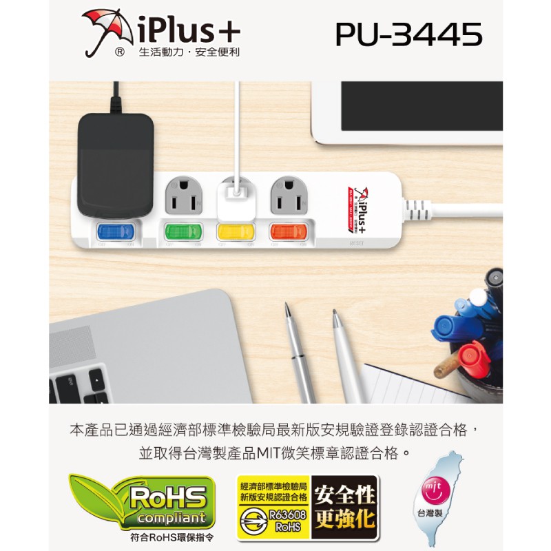 【保護傘】3P延長線4切4座(PU-3445)6尺 (180公分)|9尺 (270公分)|15尺 (450公分)Electric Sockets & Extension CordsiPlus+保護傘延長線品牌館