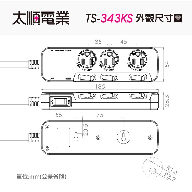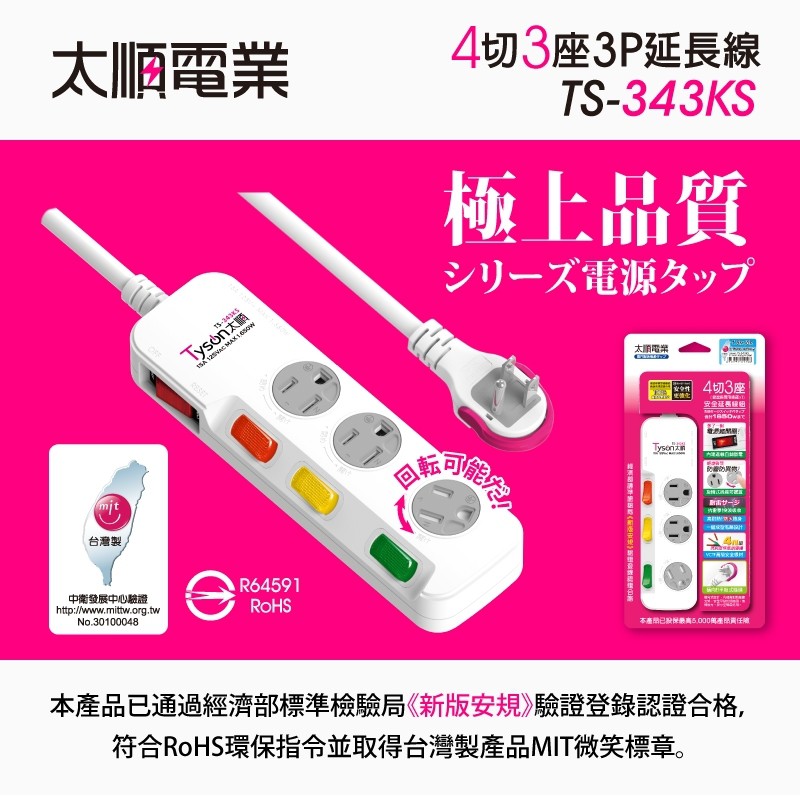 Tyson太順電業 4切3座3P延長線(TS-343KS)1.2M (120公分)|1.8M (180公分)|2.7M (270公分)|4.5M (450公分)Electric Sockets & Extension CordsiPlus+保護傘延長線品牌館