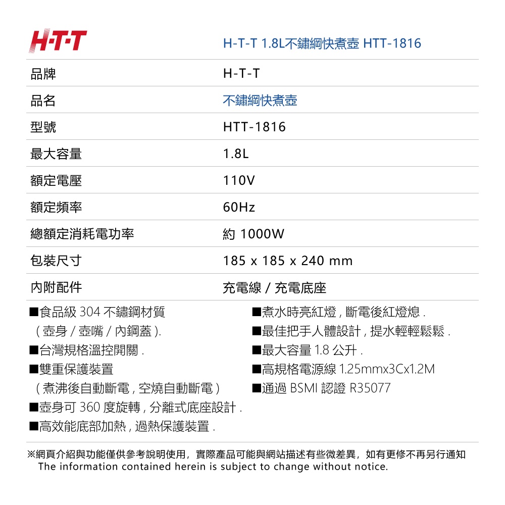 H-T-T 1.8L不鏽綱快煮壺 HTT-1816H-T-T 1.8L不鏽綱快煮壺 HTT-1816KettlesH-T-T旗艦館