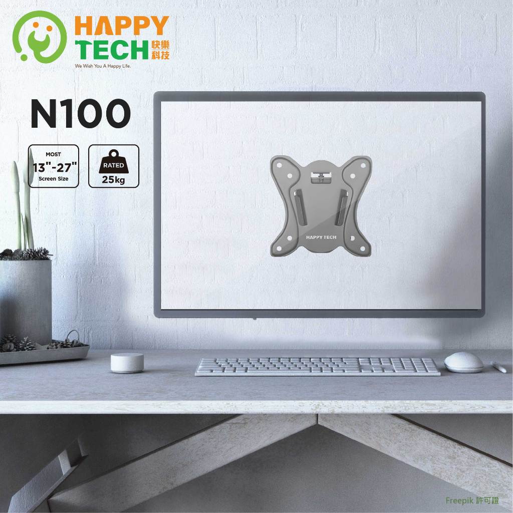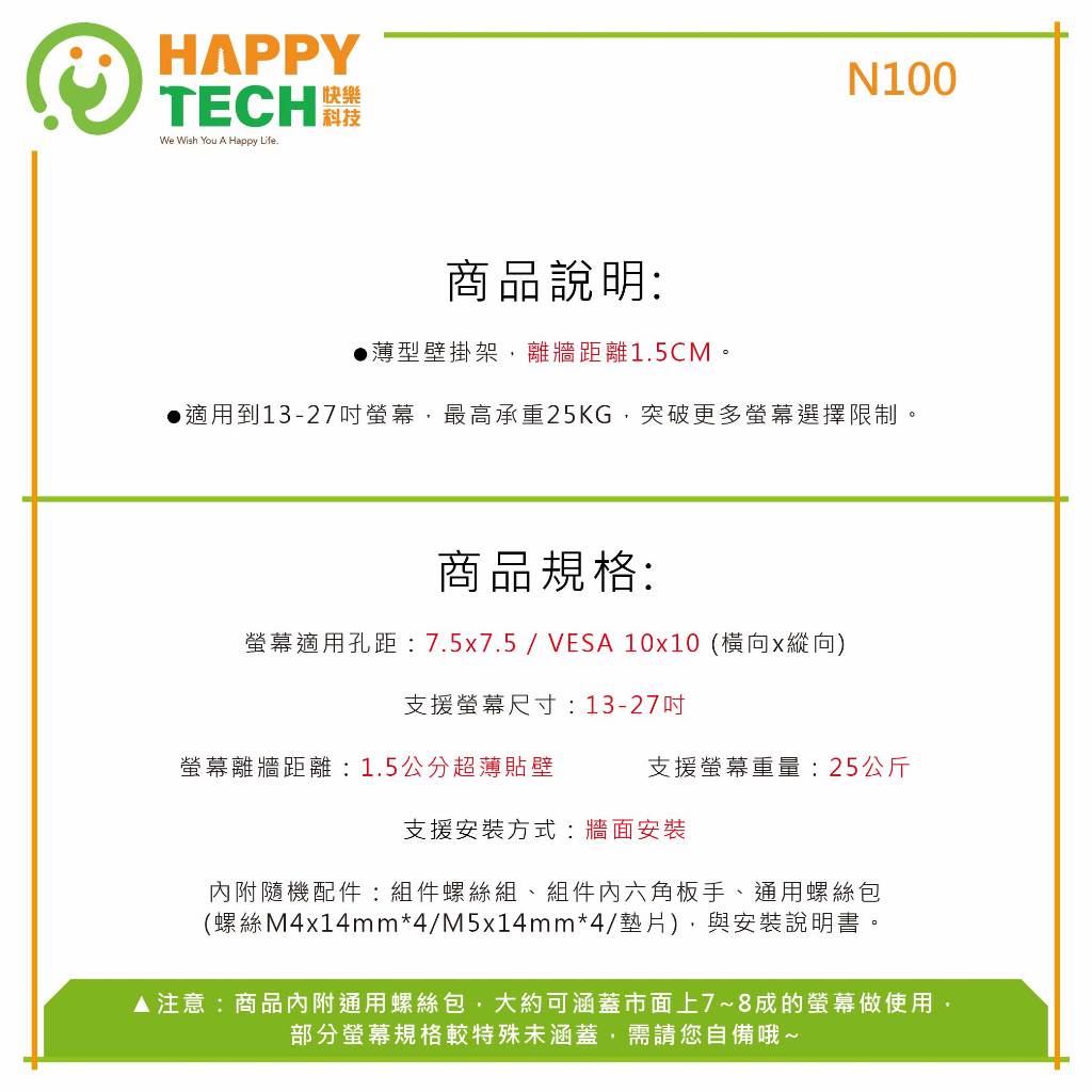 【HappyTech】N100液晶螢幕電視壁掛架 螢幕支架 超薄型固定架 適用13-27吋1組 (超商取貨限15組)TV BracketsHappy Tech 品牌旗艦館