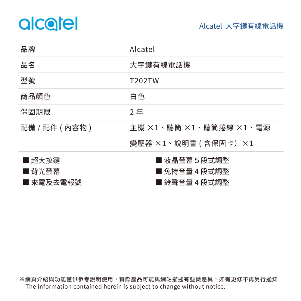 Alcatel 大字鍵有線電話機 T202TW (白)Alcatel 大字鍵有線電話機 T202TW (白)TelephonesH-T-T旗艦館