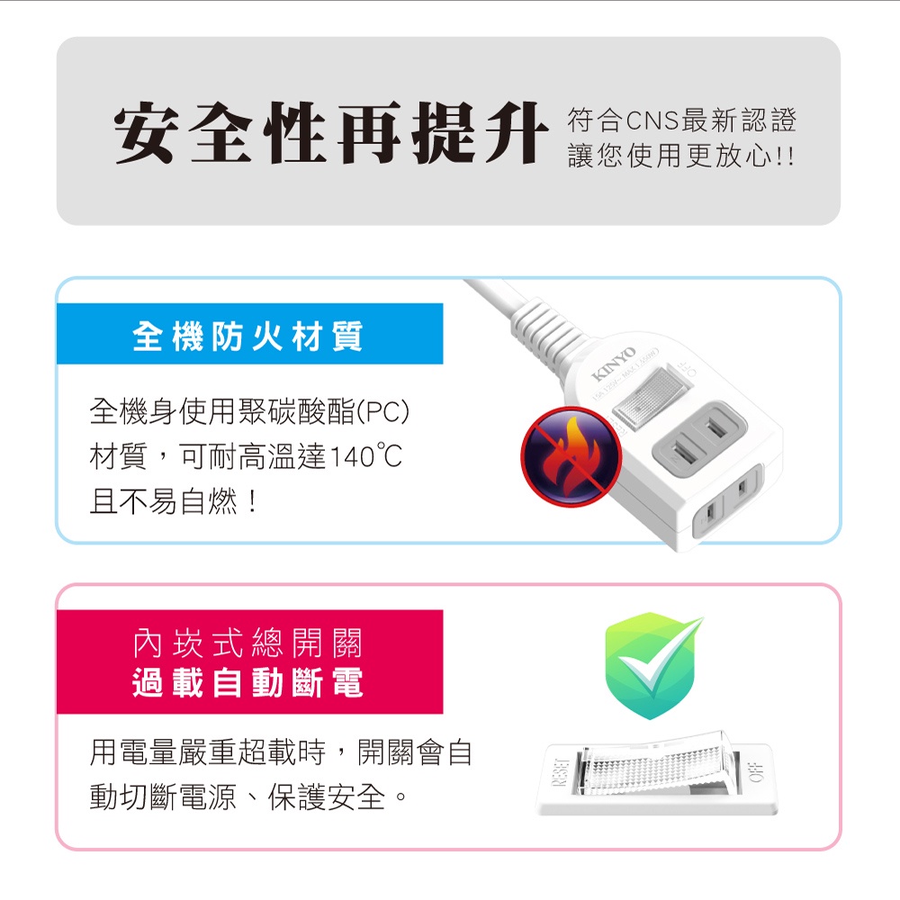 〖KINYO〗 中繼安全延長線 (NSD) 3呎/6呎/9呎 耐燃材質 | 台灣製造