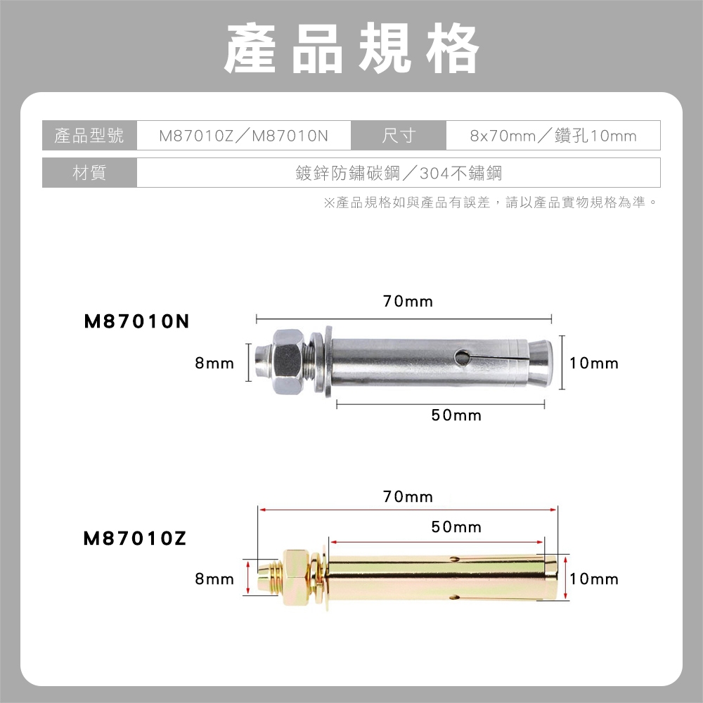 【台灣出貨】鍍鋅防鏽碳鋼膨脹螺絲 304 不鏽鋼膨脹螺絲 螺絲螺母不帶磁性 正304不銹鋼 M8 70mm 金屬 壁虎鍍鋅耐腐蝕壁虎【1支入】|304不銹鋼壁虎【1支入】TV Bracketsi-gota官方旗艦館|昶興電子