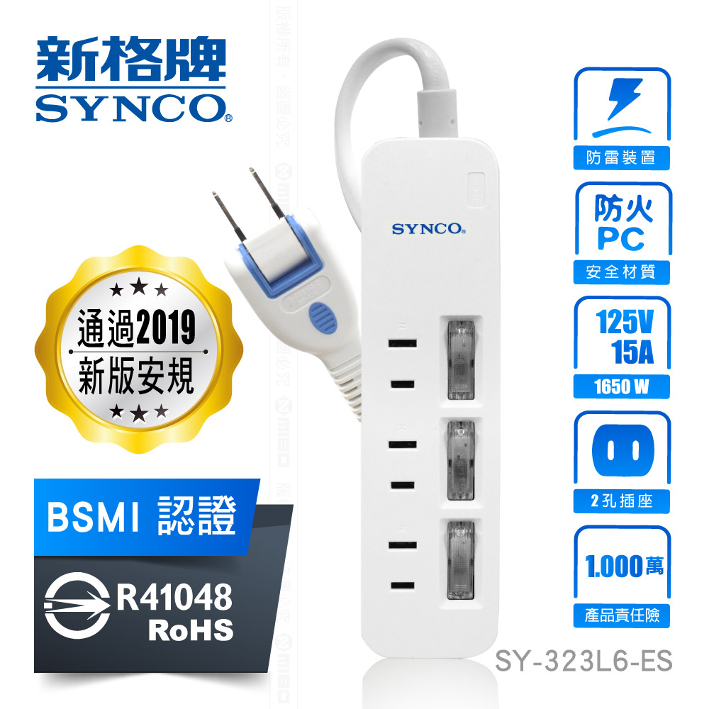 SYNCO 新格牌 新安規 雙層絕緣 防突波 過載自動斷電 安全延長線 附發票 甜甜價 2孔 6尺/9尺六開2孔6座六尺SY-626L6-ES|單開2孔3座六尺SY-123L6-ES|單開2孔3座九尺SY-123L9-ES|三開2孔3座六尺SY-323L6-ESElectric Sockets & Extension CordsMICHELIN 米其林生活精品官方旗艦館