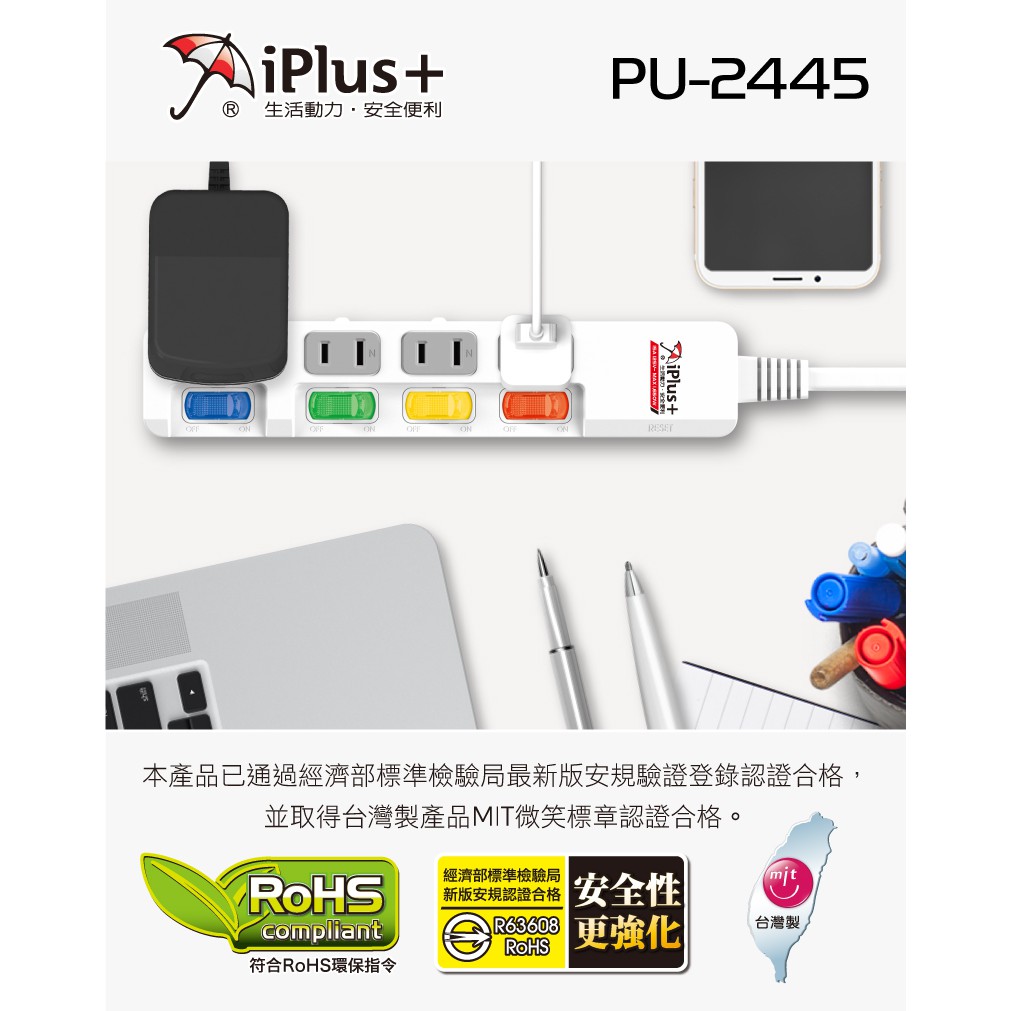 保護傘 2P延長線4切4座(PU-2445)1.8M (180公分)|2.7M (270公分)|4.5M (450公分)Electric Sockets & Extension CordsiPlus+保護傘延長線品牌館