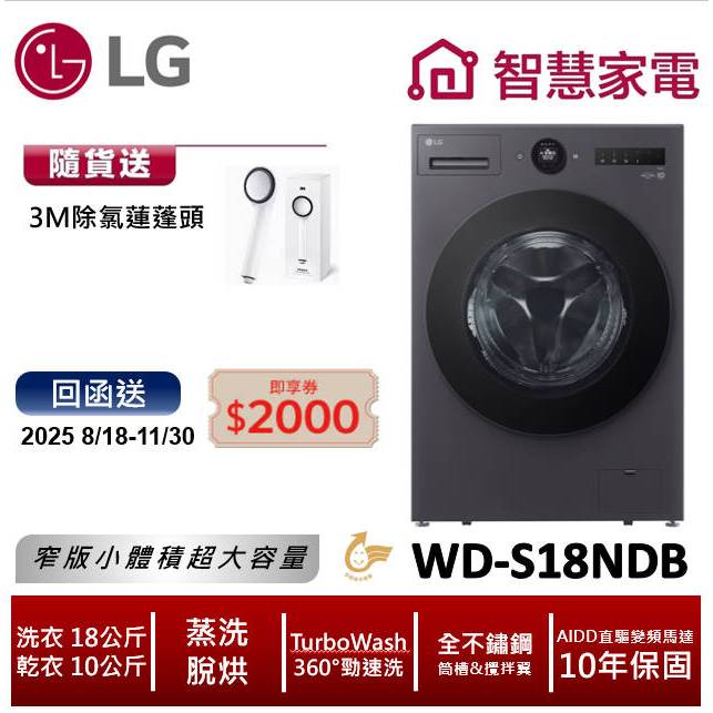 LG WD-S18NDB AIDD蒸氣變頻滾筒洗衣機(蒸洗脫烘) 送3M除氯蓮蓬頭, 回函送2000即享券WD-S18NDB|限時特賣|WD-S18NDBWashing Machines & DryersLG旗艦館