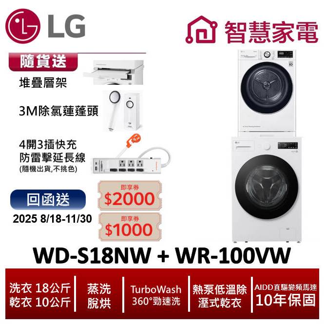 LG樂金WD-S18NW+WR-100VW洗乾堆疊 送堆疊層架,除氯蓮蓬頭,防雷擊延長線,兌換送即享券WD-S18NW+WR-100VW|限時特賣|S18NW+WR-100VWWashing Machines & DryersLG旗艦館