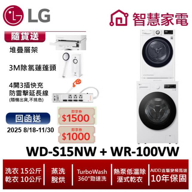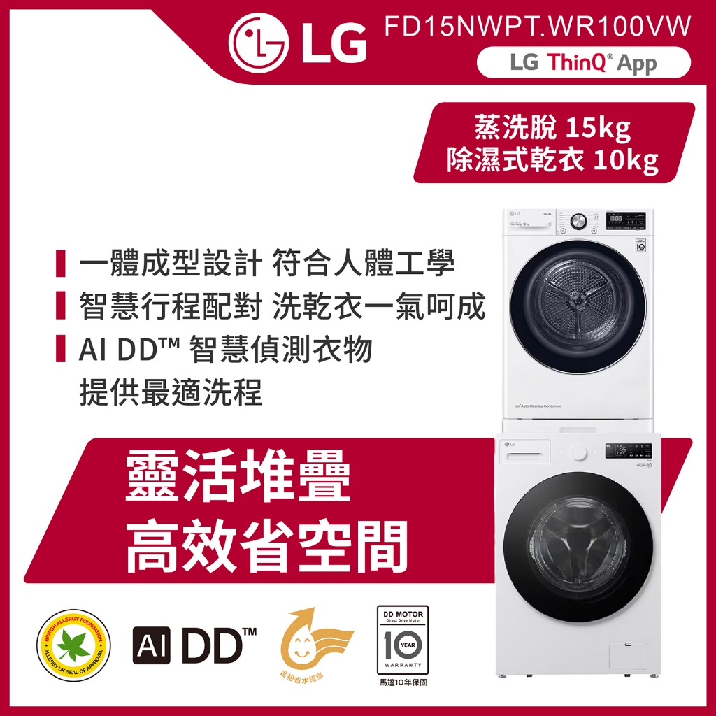 LG樂金WD-S15NW+WR-100VW洗乾堆疊 送堆疊層架,除氯蓮蓬頭,防雷擊延長線,兌換再送即享券WD-S15NW+WR-100VW|限時特賣|S15NW+WR-100VWWashing Machines & DryersLG旗艦館