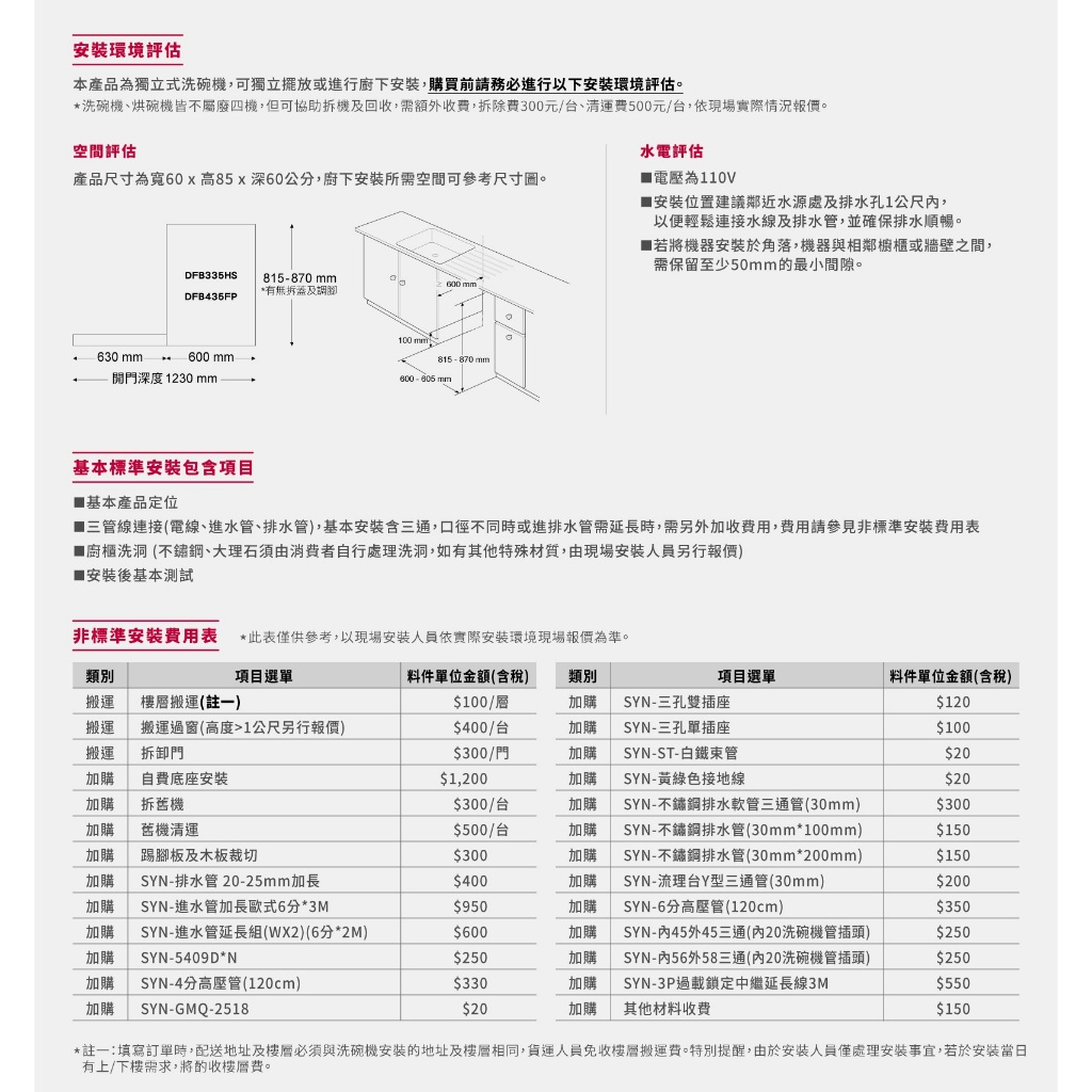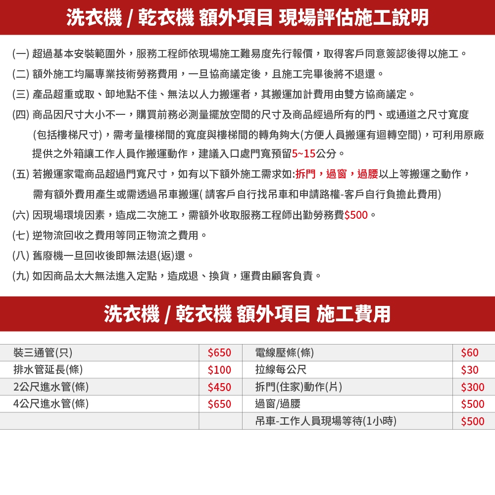 LG樂金大型家電 壁掛架施工費用(施工時間, 以安裝人員約定時間為主)購買家電的服務不另作選購66吋~74吋(含)費用$1800|50吋~59(含)吋費用$900|旋臂式43~55吋(含)(雙臂)1500|旋臂式56~65吋(含)(雙臂)1800|43吋~49吋(含)費用$600|60吋~65吋(含)費用$1200|75~86吋(含)費用$2100|旋臂式43吋(含)(單臂)費用$1300|旋臂75吋~86吋(雙臂)費用$2700OthersLG旗艦館