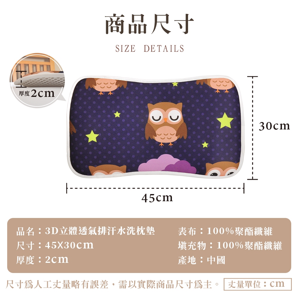 【金大器】3D立體透氣排汗水洗枕墊 新生兒枕頭 透氣吸汗平枕 嬰兒平枕 平枕初生枕 3D超透氣嬰兒涼枕貓頭鷹,1入組|貓頭鷹,2入組PillowsJINDACHI金大器精品寢具-官方旗艦|天絲/床包/棉被/枕頭/床墊/椅靠墊