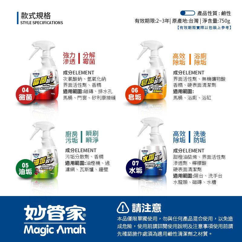【妙管家】萬用清潔用品 水垢 去黴 廚房清潔 廁所清潔 清潔 黴菌 皂垢 油垢 水垢 殺手 霉菌殺手 水垢殺手750g-07水垢殺手|750g-04黴菌殺手|750g-05油垢殺手|750g-06.皂垢殺手|補充瓶750g_07水垢殺手(沒噴頭)|補充瓶750g_08油垢殺手(沒噴頭)|補充瓶750g_09皂垢殺手(沒噴頭)|補充瓶750g_14.黴菌殺手(沒噴頭)Cleaning AgentsLAVIDA 育兒好好玩!